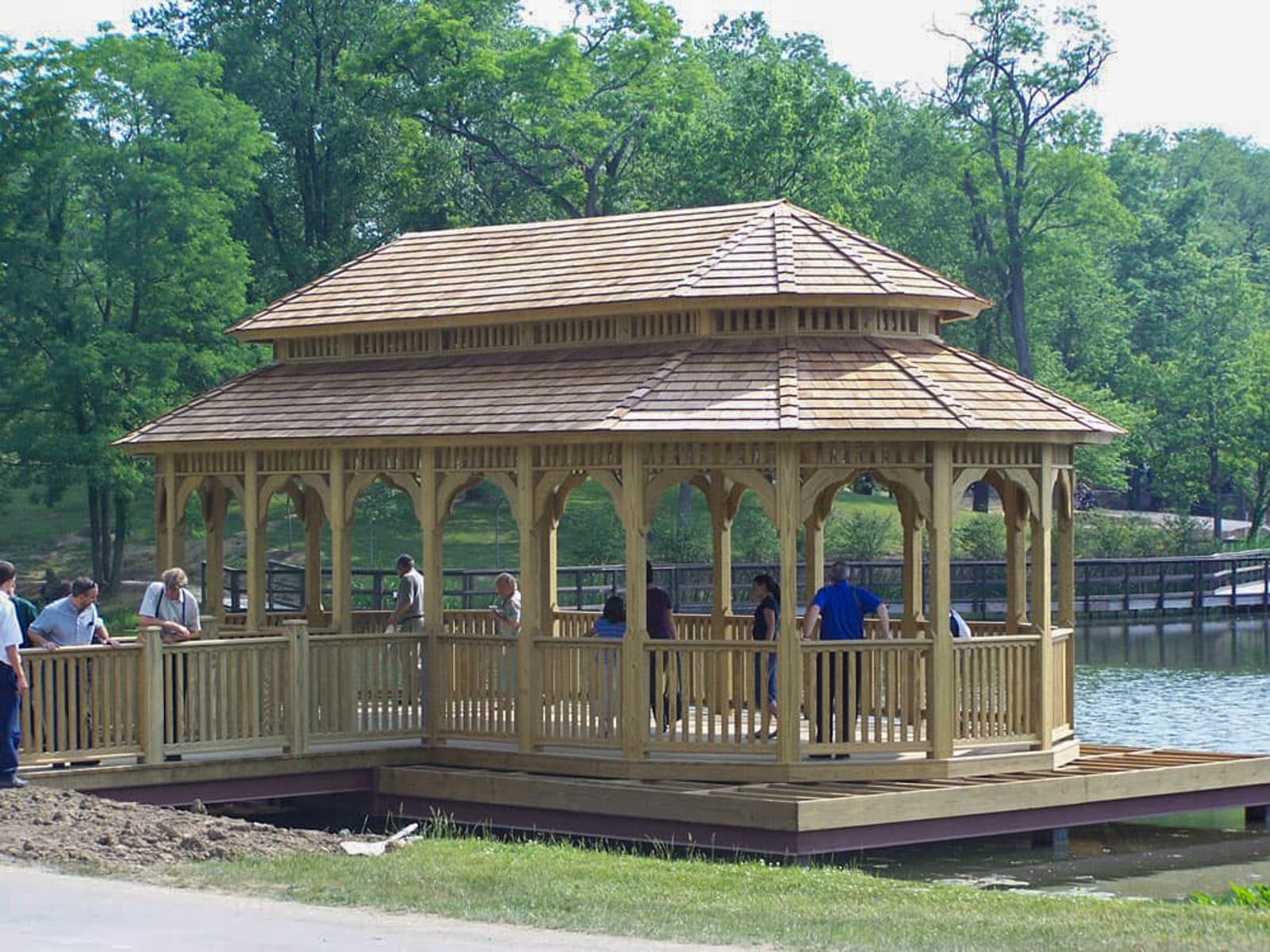 The milling of lumber creates an extremely smooth surface. For wood pavilions, you can choose a factory-stained finish, or wait to apply the first coat about three months after installation, so most checking is visible and the drier surface accepts stain more evenly; for care tips, see this blog post about “Preserving Outdoor Wood”. For timber frames, we recommend selecting the factory-stained timber option for optimal results and strong UV protection, and reapplying stain on a consistent schedule as exposure and weather demand.