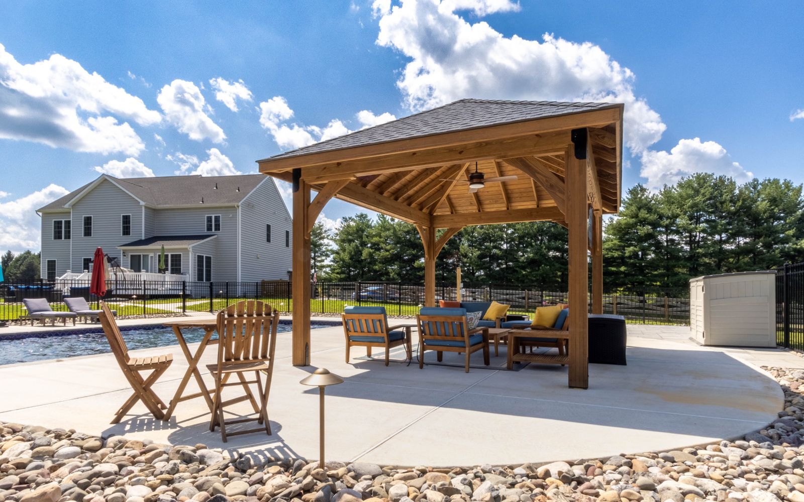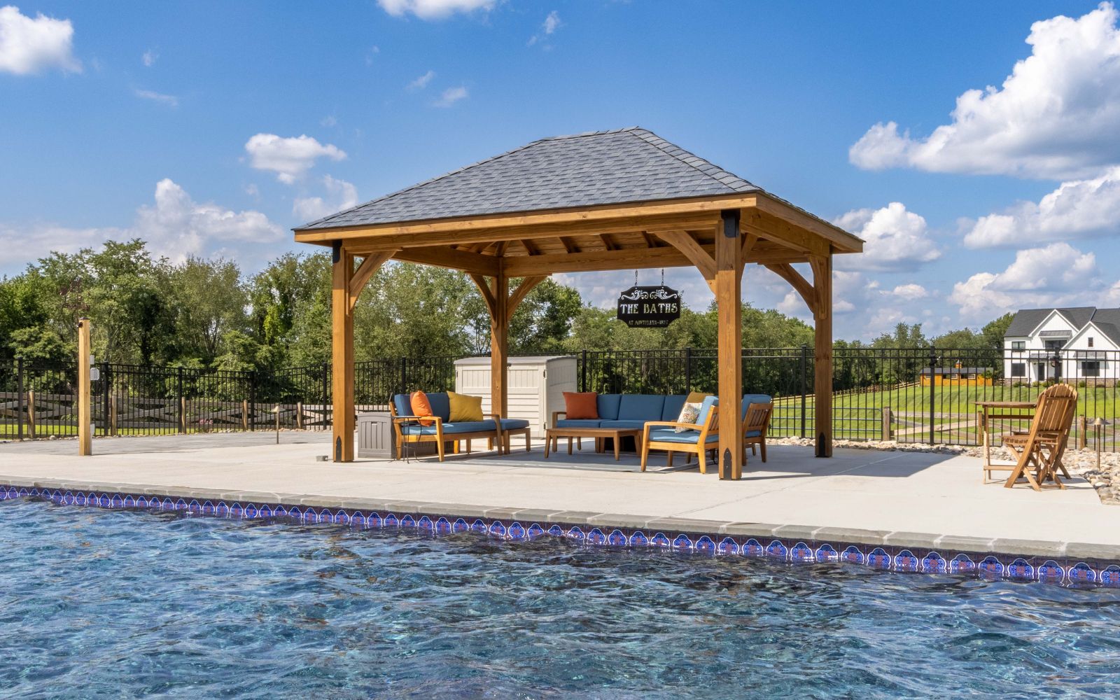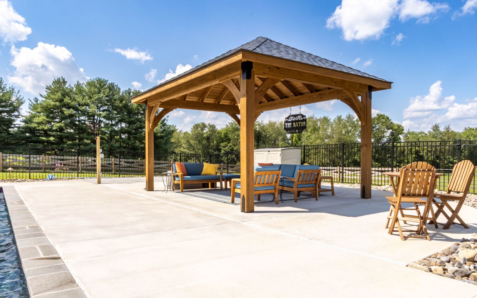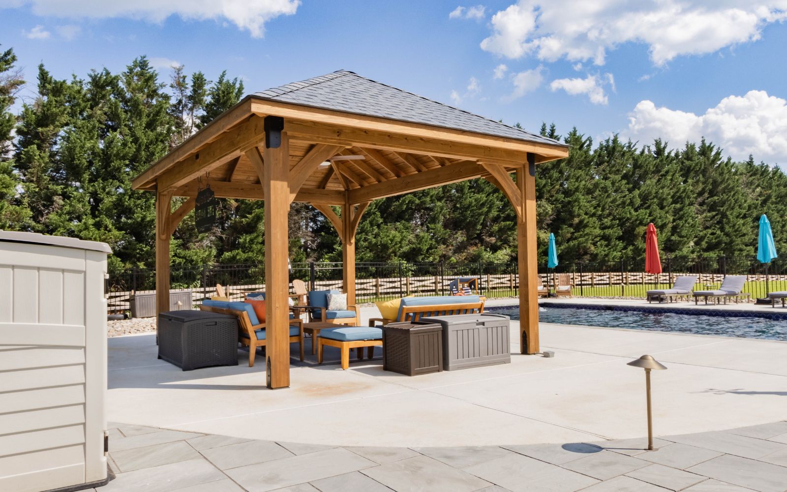 With its graceful wooden structure and carefully designed overhang and pitch, the Cheyenne Pavilion provides shelter from the sun with an inviting poolside retreat. Whether you’re hosting a pool party or enjoying a quiet moment to yourself, this pavilion creates a refined space for any occasion.