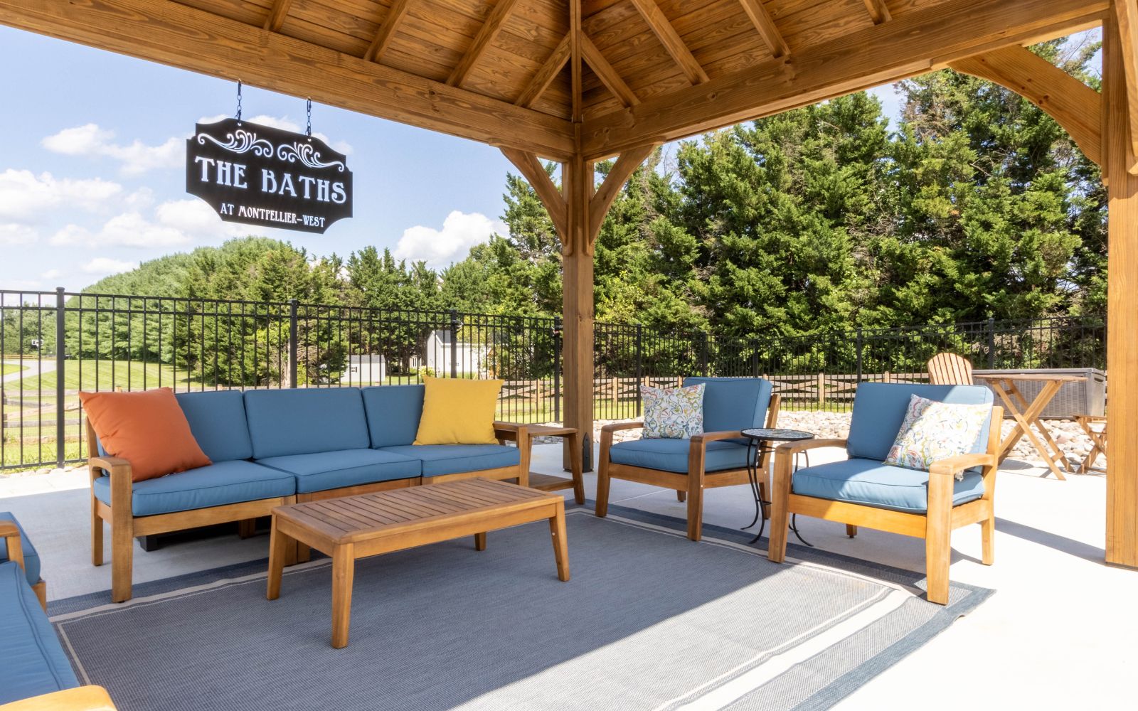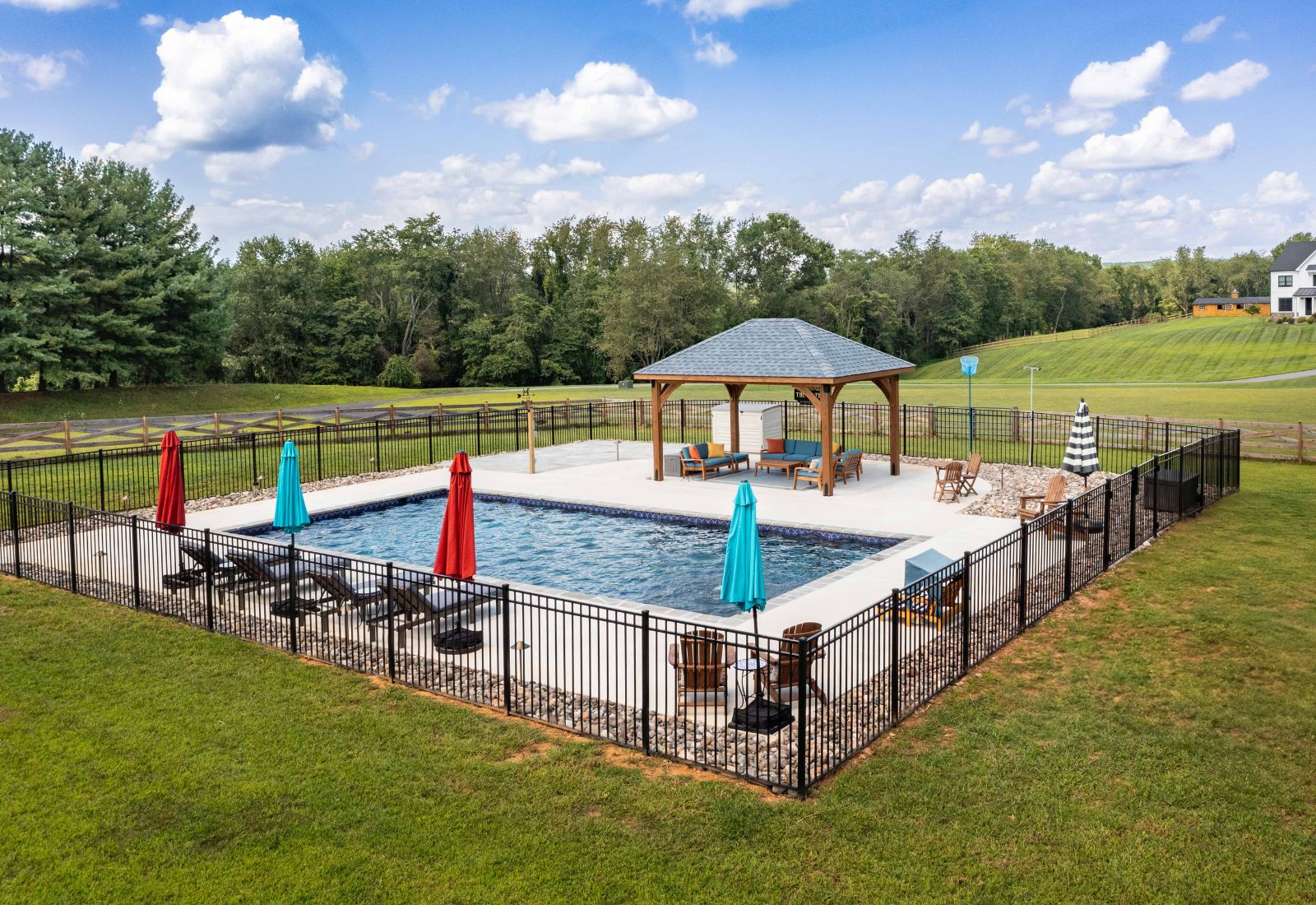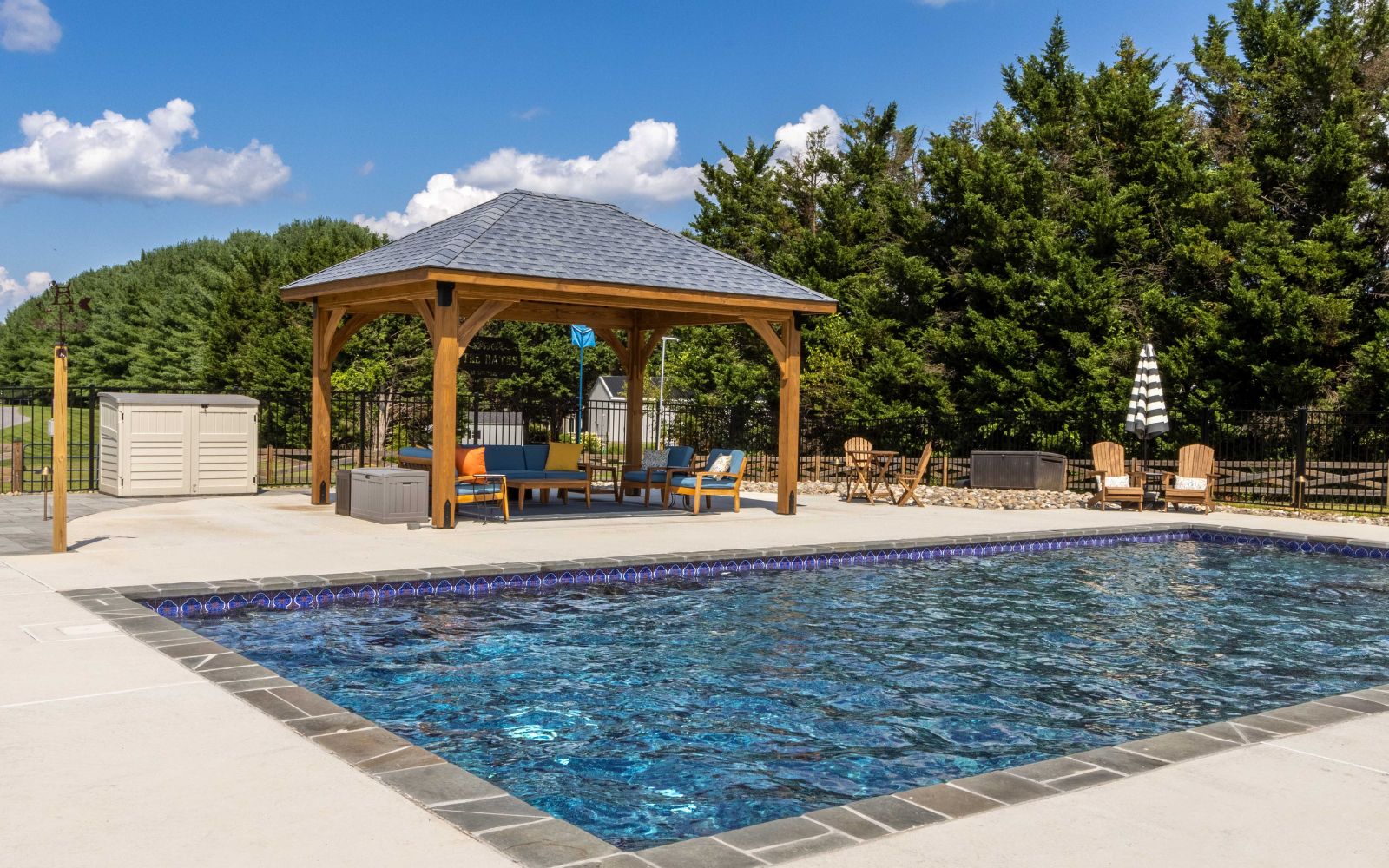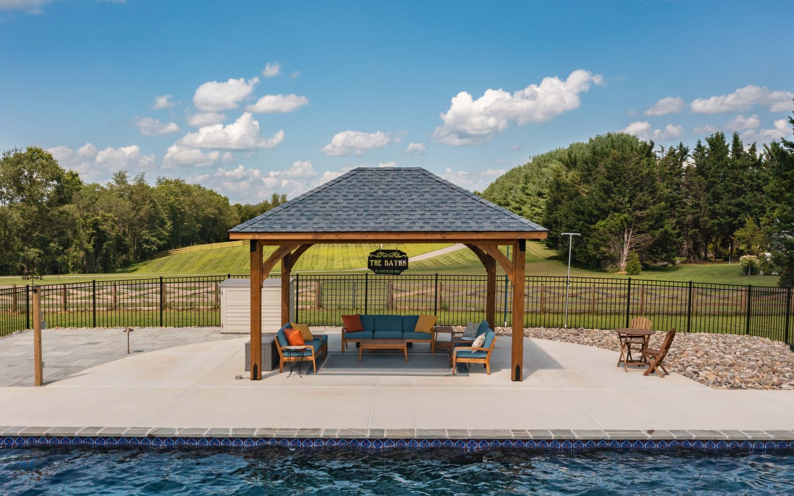 With its graceful wooden structure and carefully designed overhang and pitch, the Cheyenne Pavilion provides shelter from the sun with an inviting poolside retreat. Whether you’re hosting a pool party or enjoying a quiet moment to yourself, this pavilion creates a refined space for any occasion.