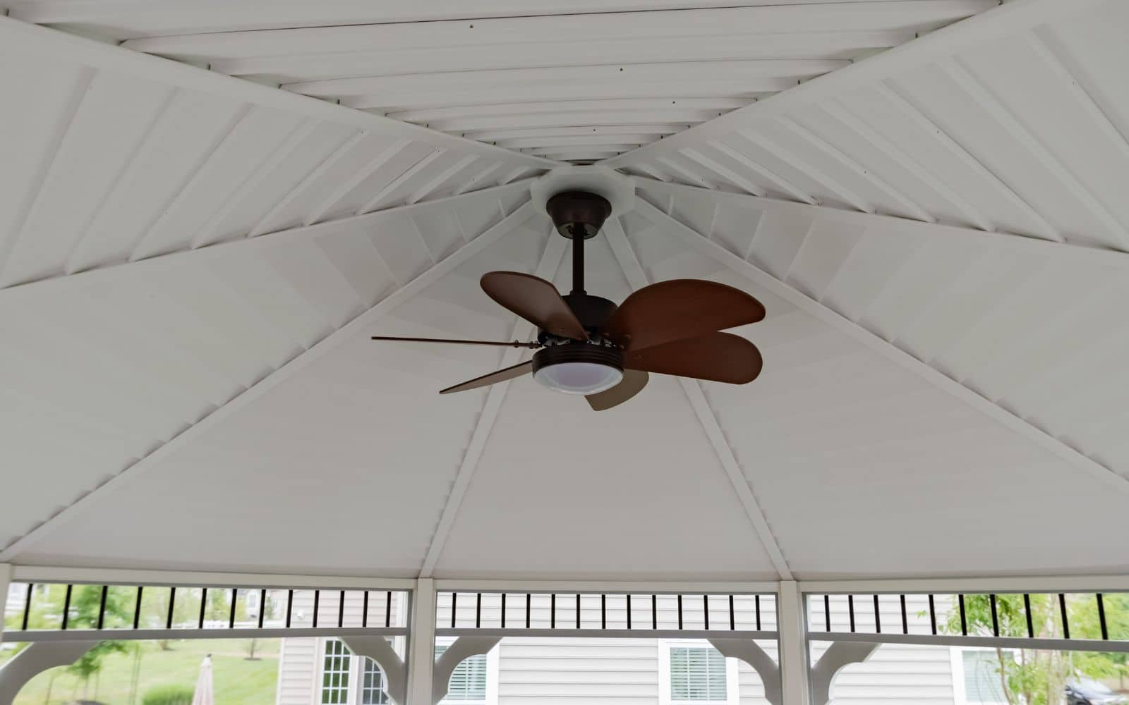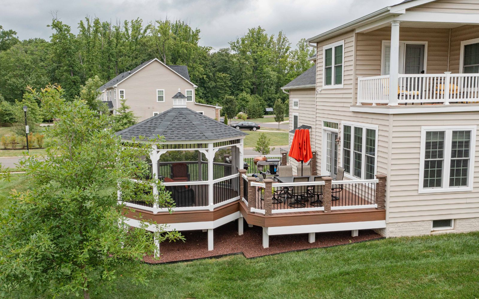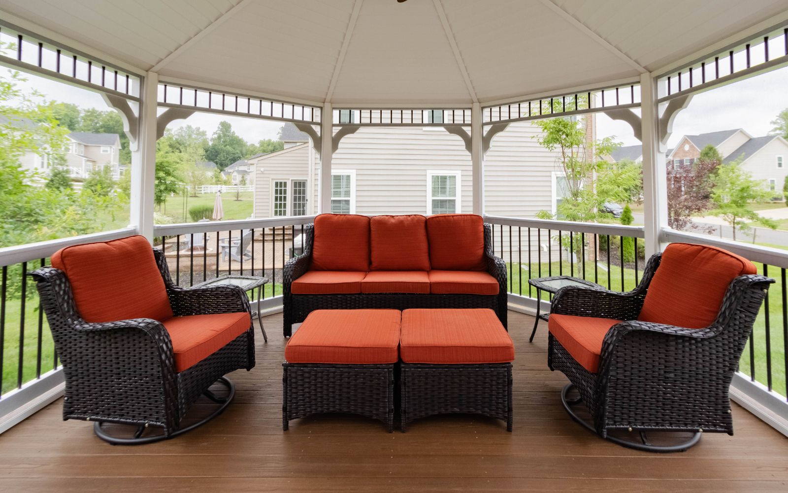Check out this 14′ Octagon Vinyl Gazebo in Bowie MD attached to a back porch in this backyard. The bright vinyl creates a nice contrast with the yard and house and seamlessly joins the deck for a simultaneously inviting and sophisticated look.