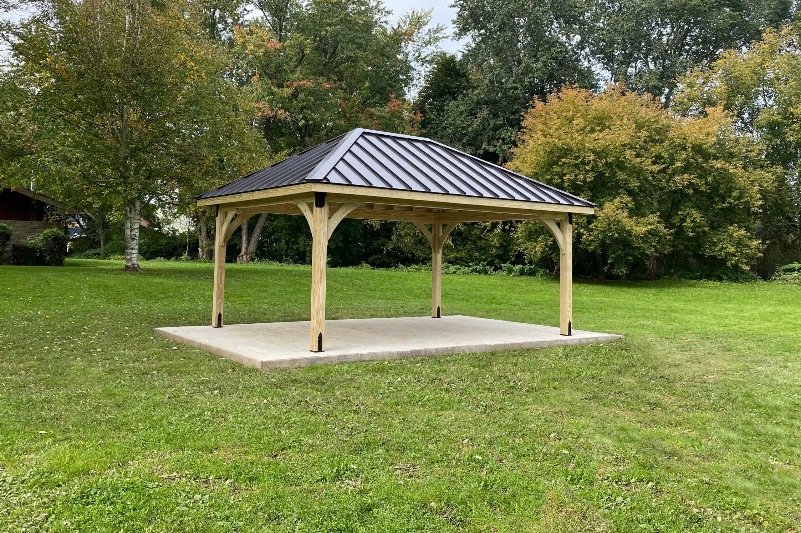 Our Cheyenne wood pavilions bring an elevated sense of class to your outdoor covering. The Cheyenne style pavilion features wider dimension posts and a roof overhang. These elements bring a strong and bold look to the pavilion. This wood pavilion in Cortland, NY, highlights the beauty of the wood it’s constructed from. Its unfinished nature allows the wood’s character to shine through and be the focal point of the structure. Paired with a bronze-color metal roof, this classic contrast demands attention and respect while still blending into the natural environment of its surroundings.