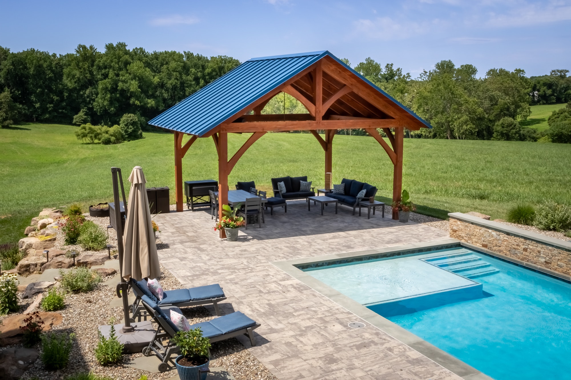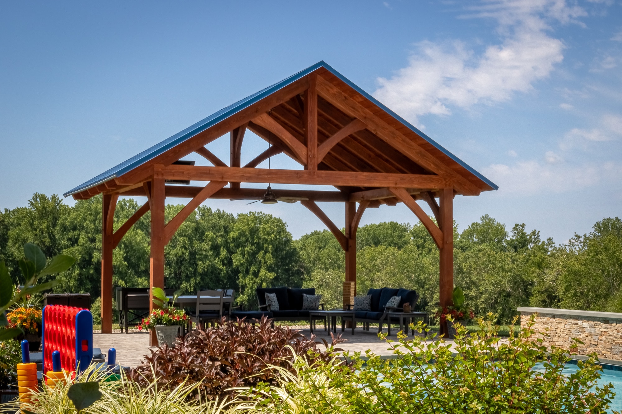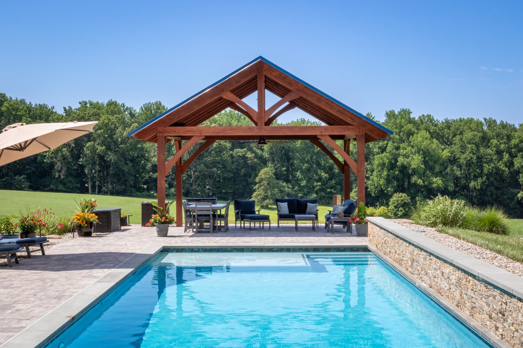 This poolside 18×14 Kingston Timber Frame Pavilion in Dayton, MD, perfectly complements the backyard of this property. It adds a relaxing area to enjoy the natural beauty surrounding the property. The timber frame beams used to craft this structure have the perfect amount of rustic beauty for this setting.