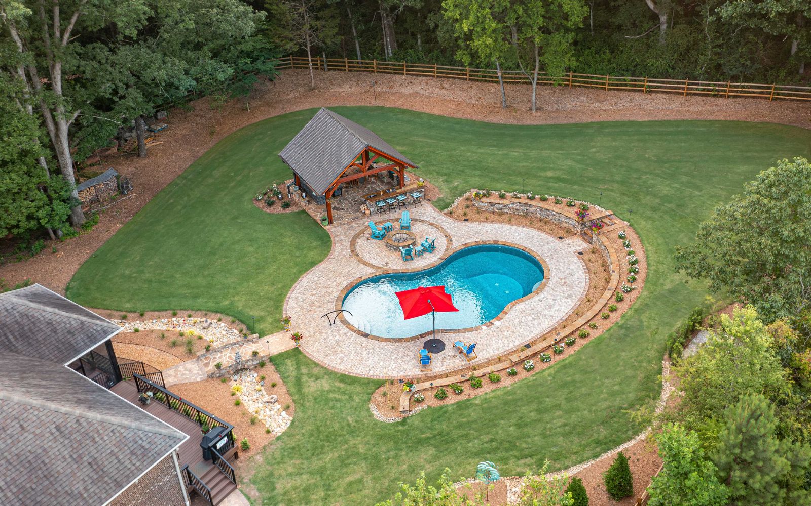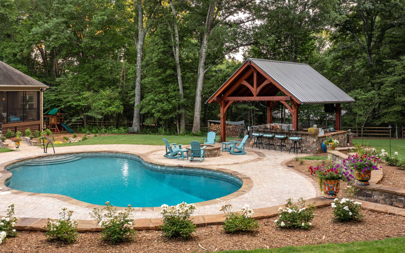 This 18×18 Kingston Pro Timber Frame Pavilion in Easley SC is a fantastic way to elevate your outdoor space. In this example, the 18×18 Kingston Pro Timber Frame Pavilion creates the perfect covered area to enjoy this gorgeous pool and fire pit. With a built-in bar and grill space as well as a television and lighting system, this is the go-to space for hosting.