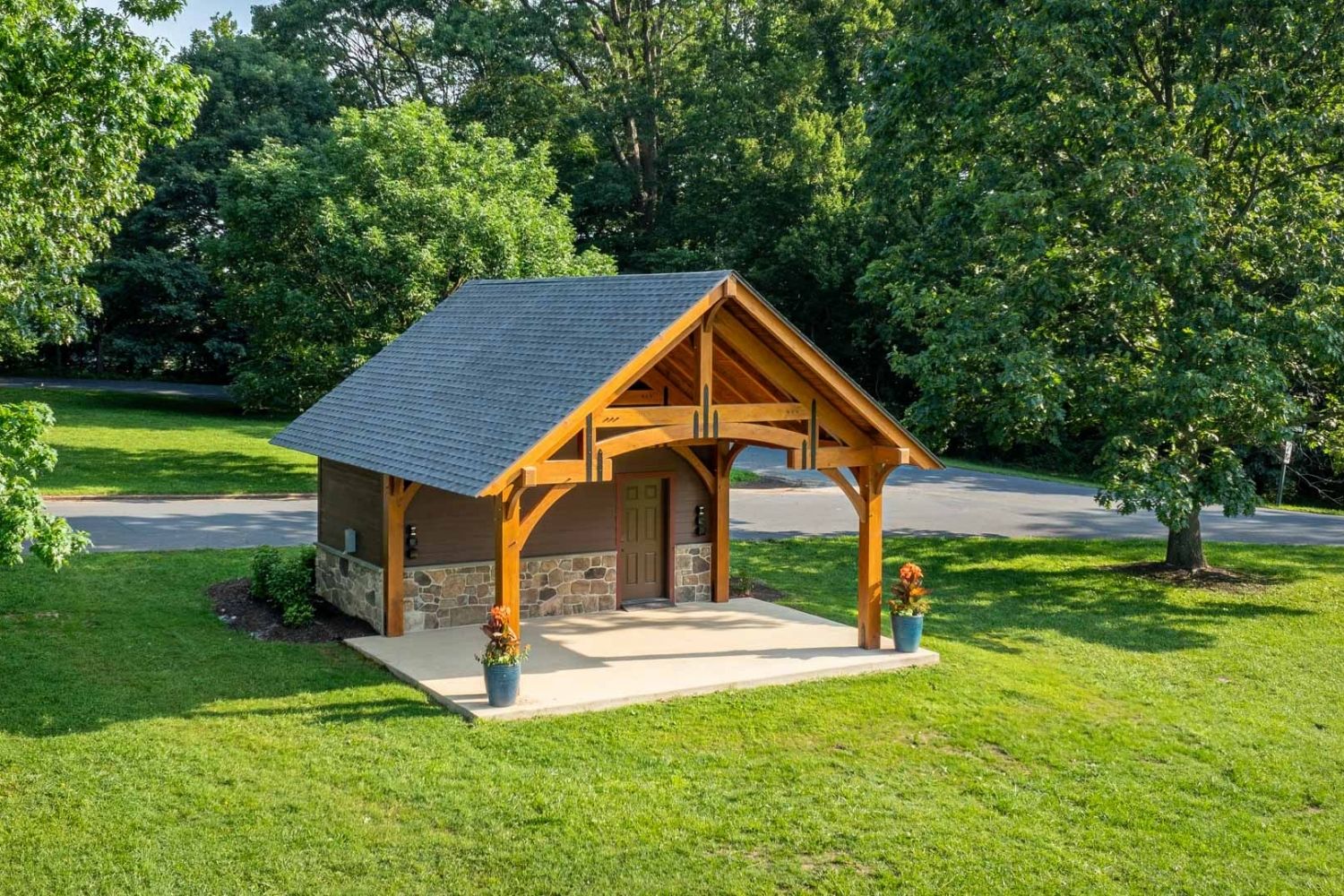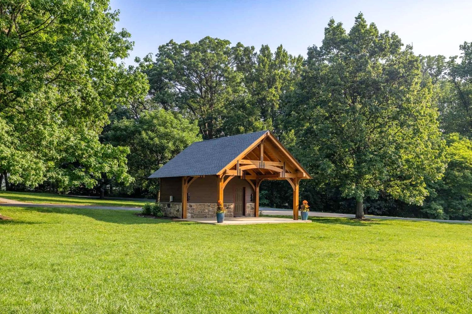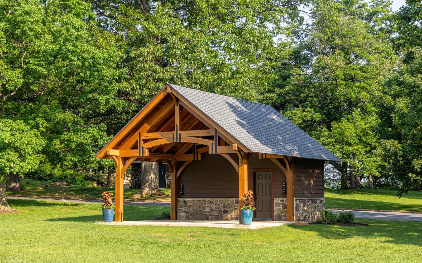 Finished in a warm Butternut UTF stain and topped with a Pewter Gray roof, this pool house adds a perfect balance between rustic elegance and modern style. The exposed timber beams and custom details reflect the Grand Teton’s signature design, blending strength, beauty, and craftsmanship.