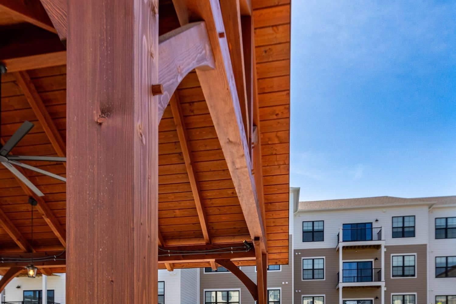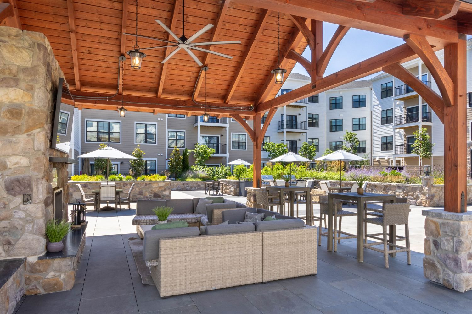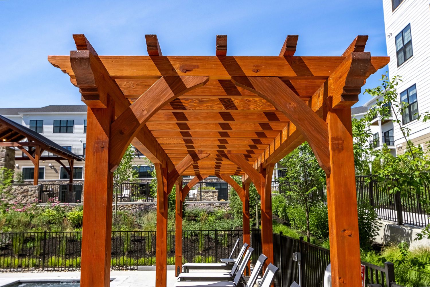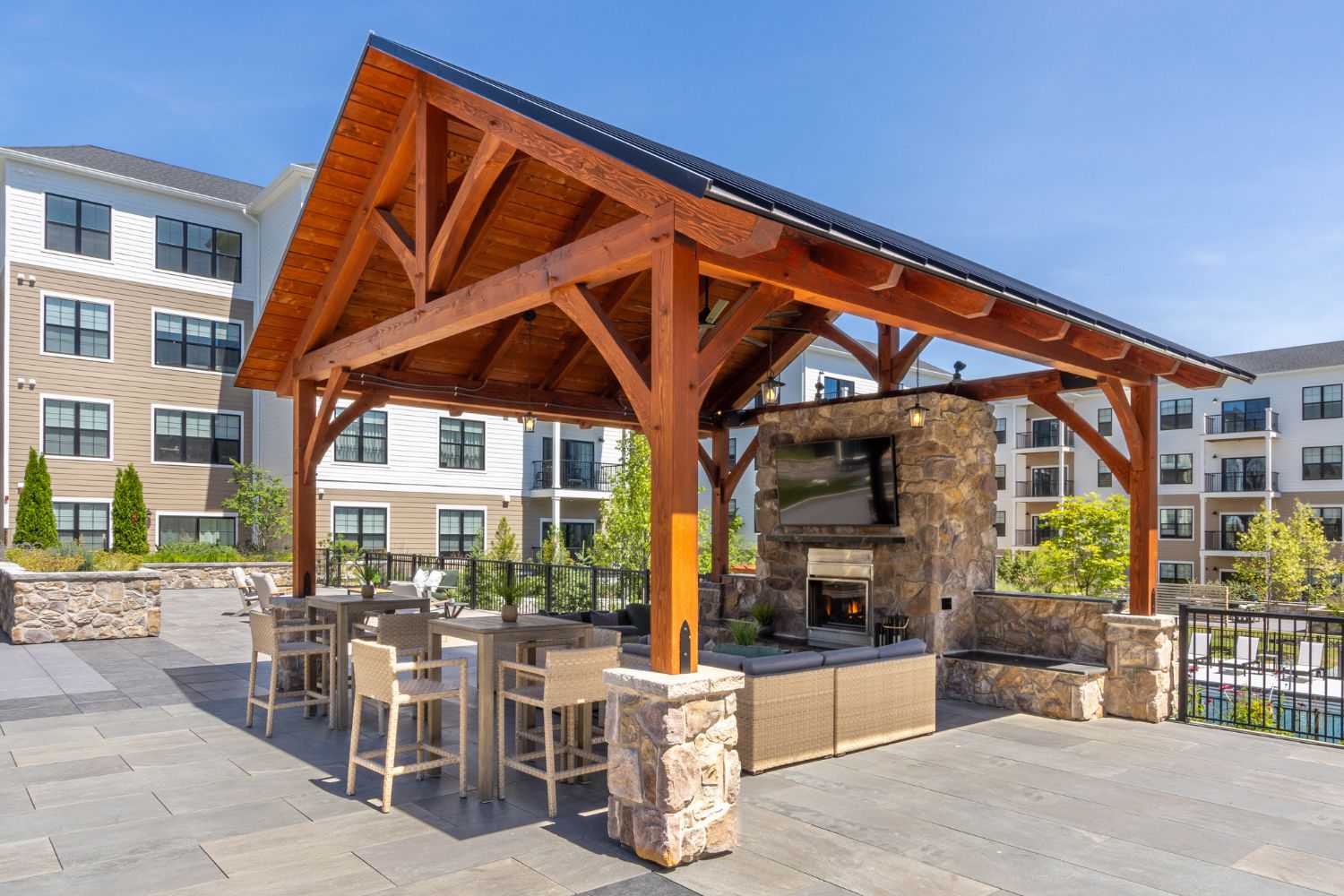This apartment complex features both our 20×20 Kingston Pavilion and our 7×30 Boulder Pergola. The 20×20 Kingston Pavilion and 7×30 Boulder Pergola combo in Newtown Square, PA, creates a relaxation station of our wildest dreams. Sit poolside under the half-shade created by the Boulder Pergola and then relax under the cool shade created under the Kingston Pavilion. Or, in the cooler months, curl up by Kingston’s stone fireplace and TV.