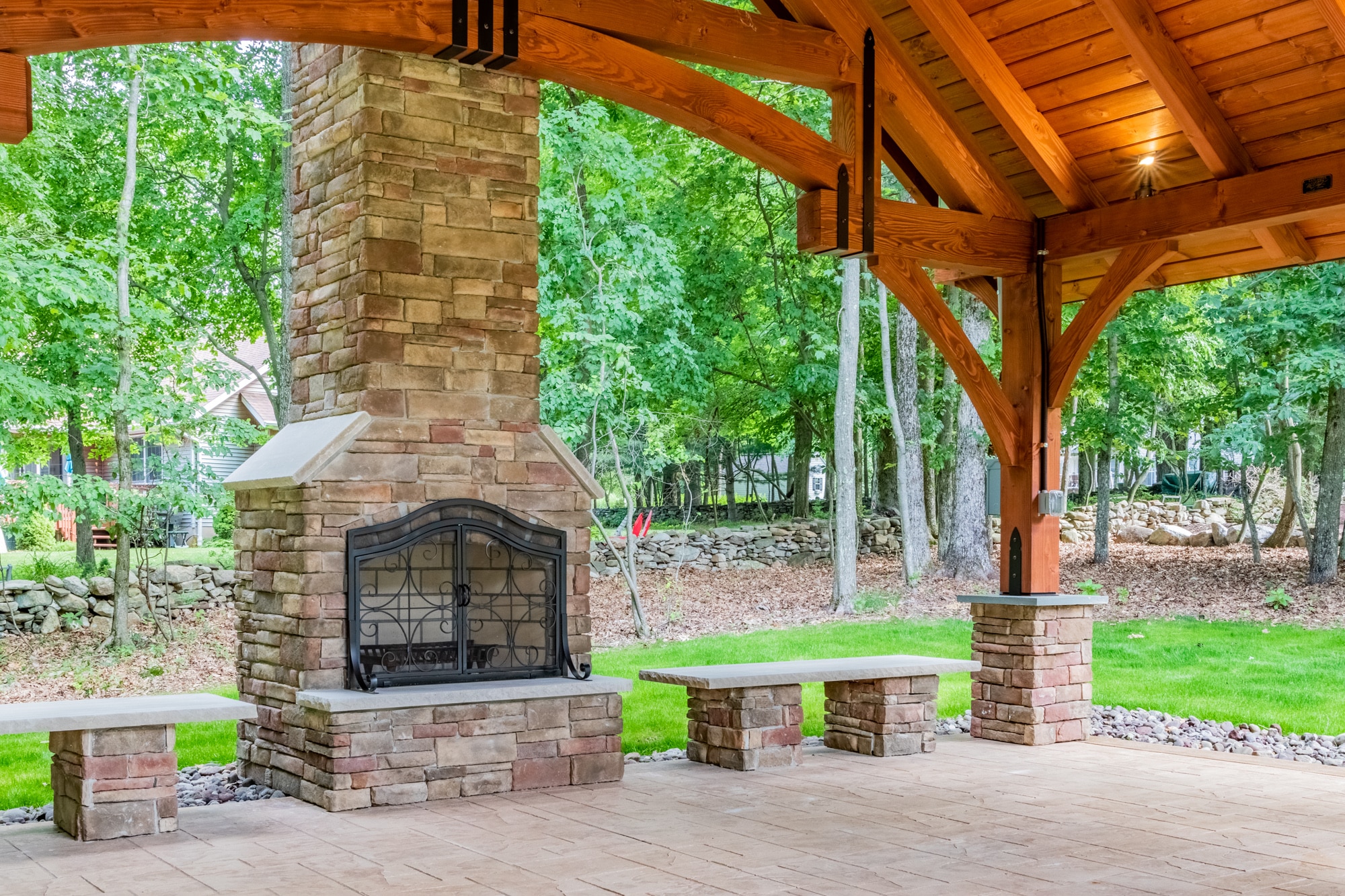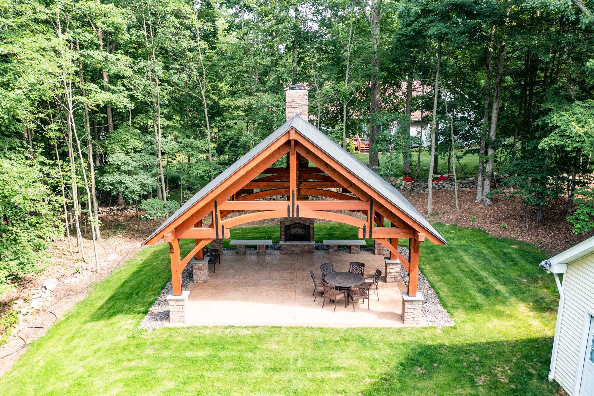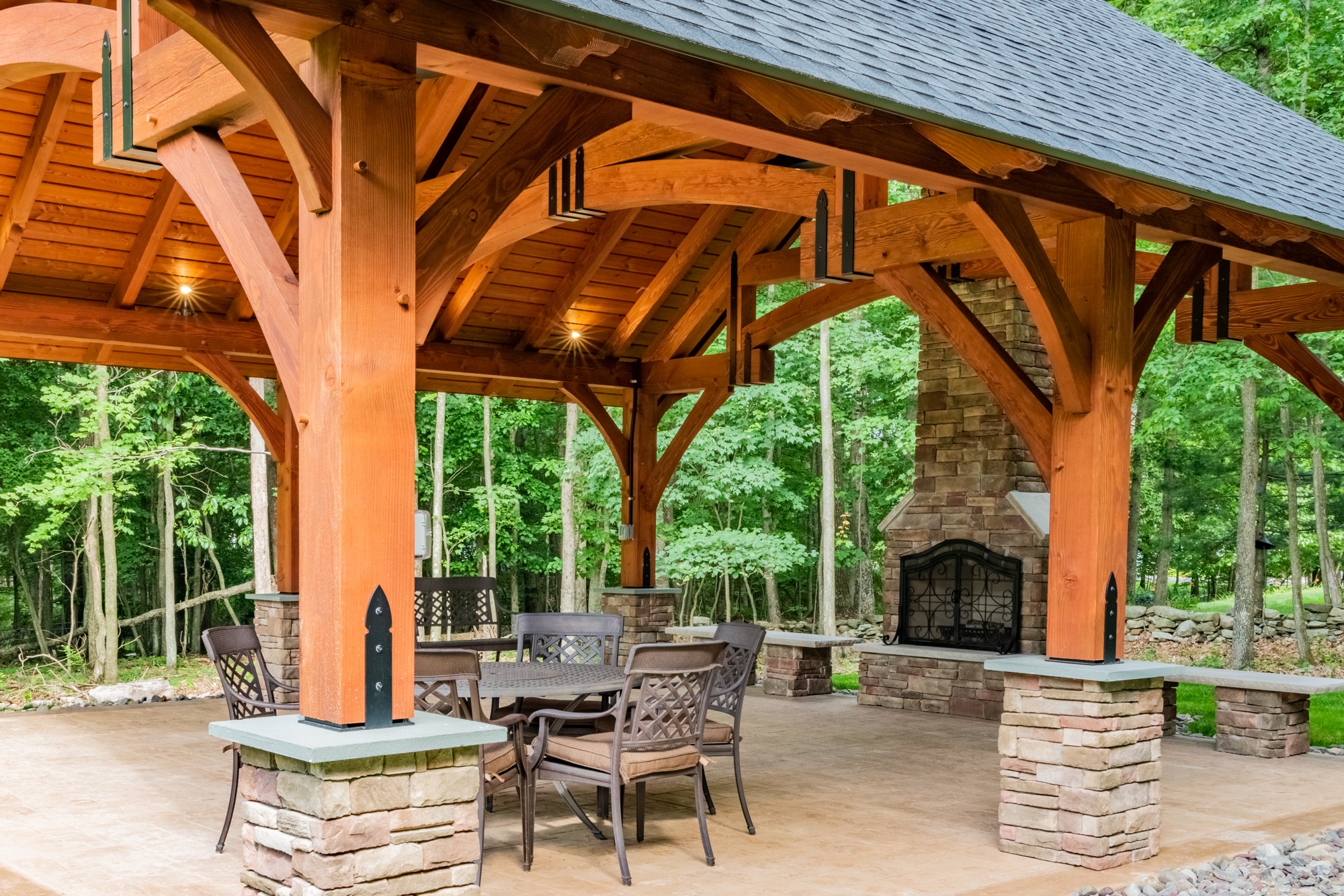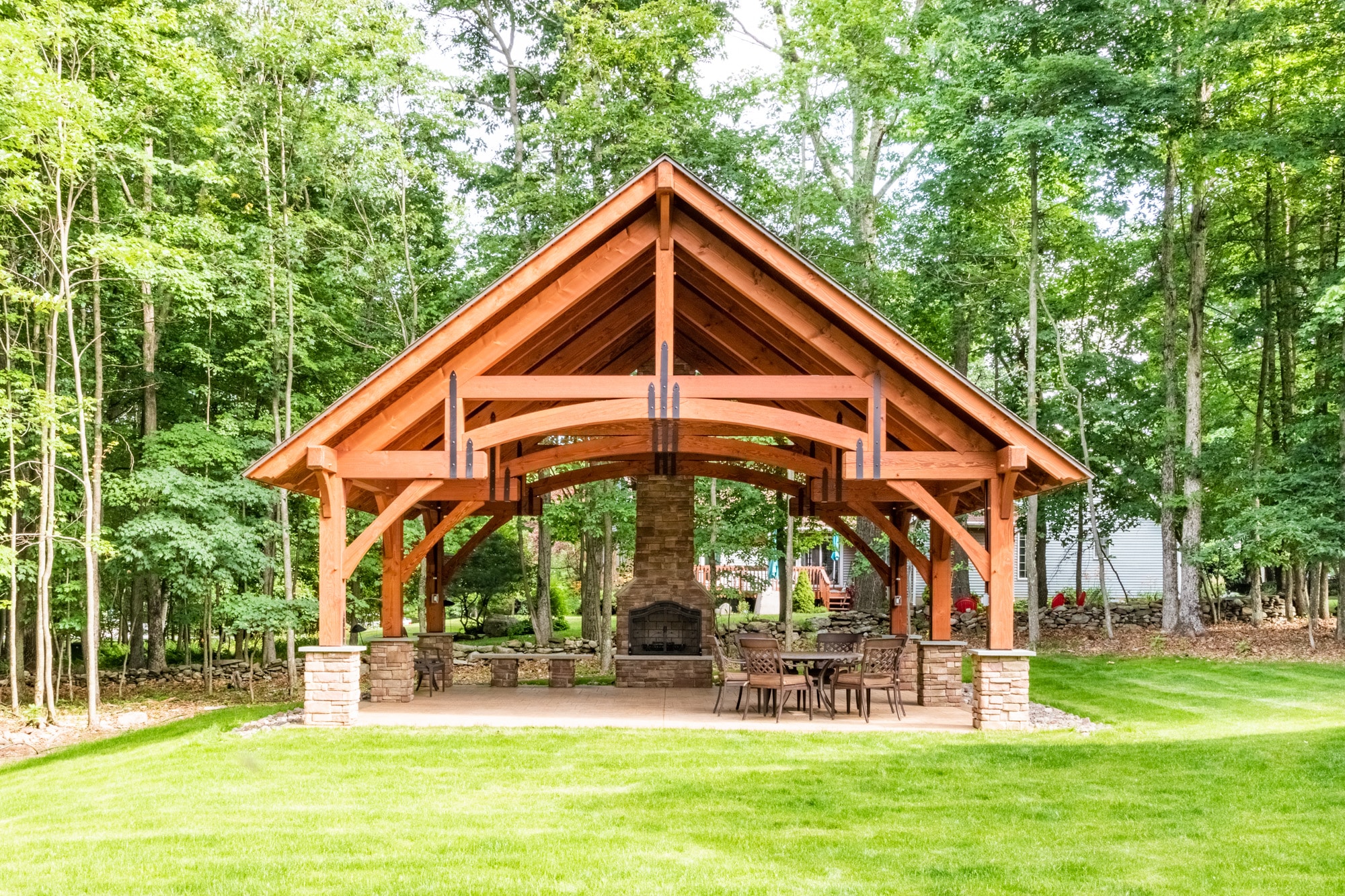 Designed to delight and inspire, this 24×24 Grand Teton Timber Frame Pavilion makes this Mountain Top, PA, backyard the perfect place to enjoy Pennsylvania’s natural beauty. The ideal place to gather with your friends and family, this pavilion features a stunning stone fireplace and seating area to make the cold nights warm and the warm nights fun! This project also features our Jarrah Brown stain color, Charcoal roof color, and exposed rafters.