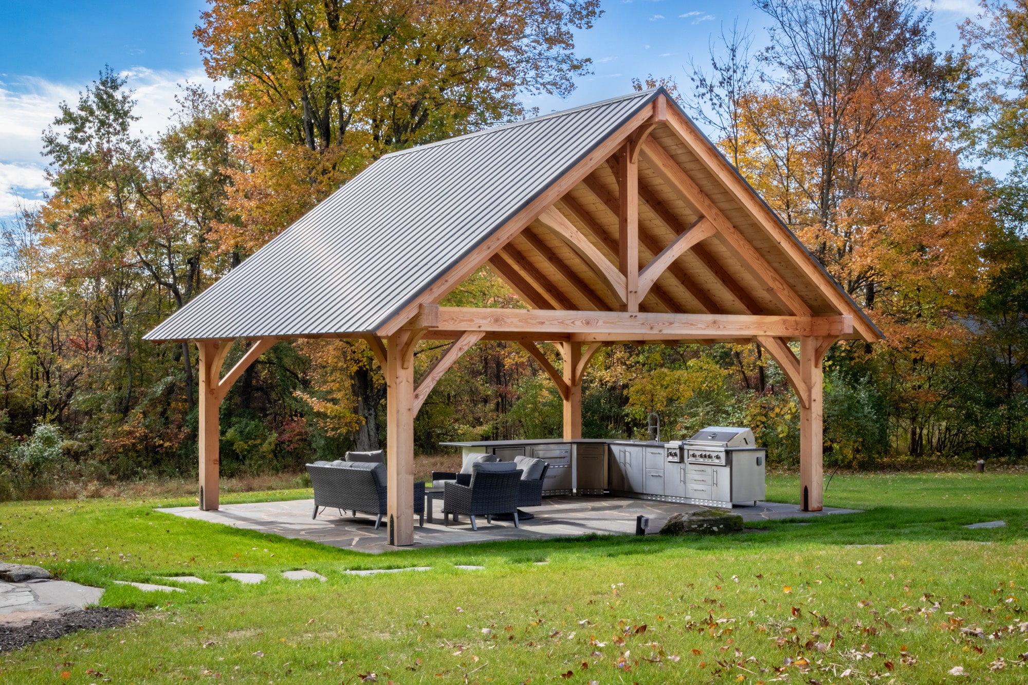 Our Kingston Pro pavilions are just one of our timber frame pavilion models. Our outdoor pavilions are perfect for hosting outdoor events, such as weddings and parties, but are also available in smaller sizes that will make any backyard into comfortable outdoor living space. Not only do these pavilions look appealing, they also provide a relaxing area protected from the sun and rain.
