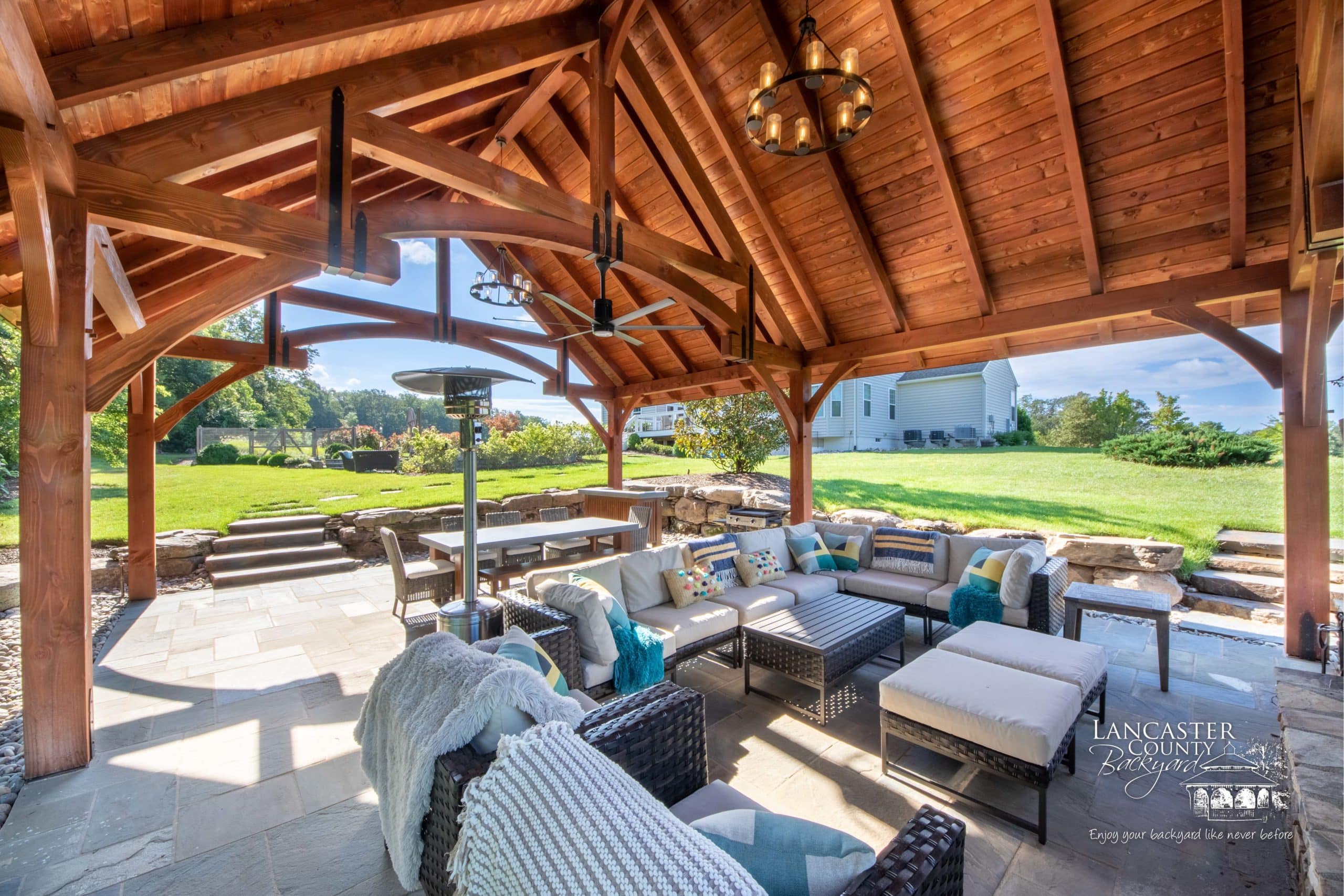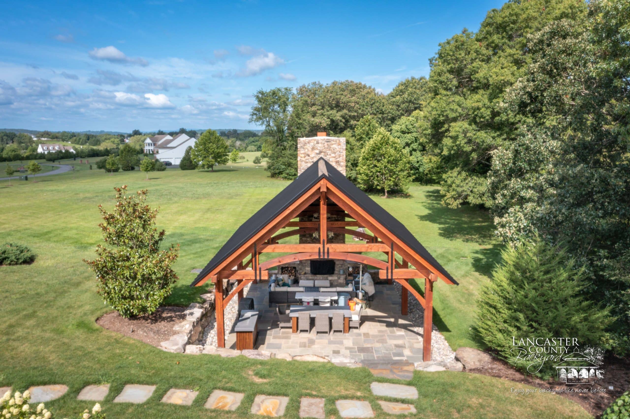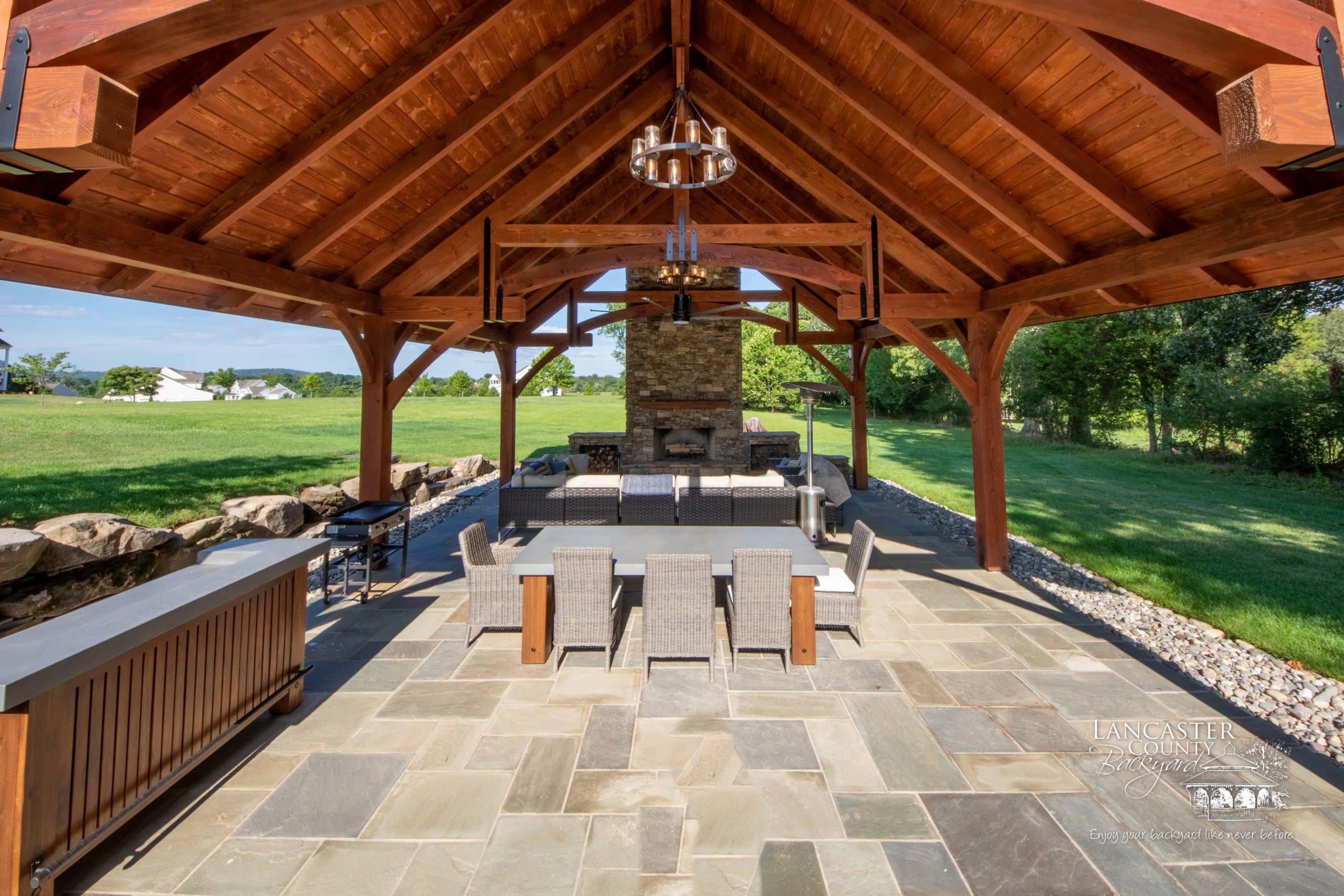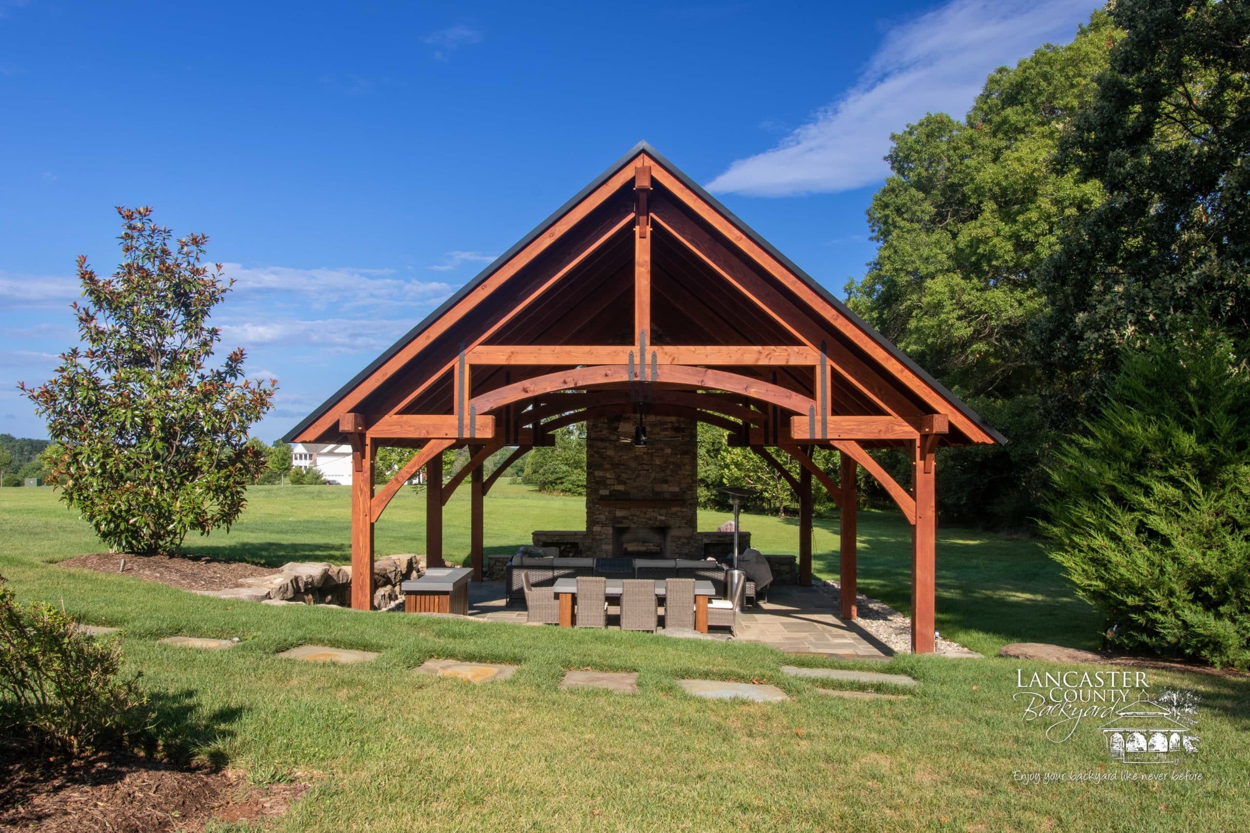 This 24×32 Grand Teton Timber Frame Pavilion was built to optimize the perfect outdoor venue for all your hosting needs. An ultimate backyard retreat, this pavilion features a magnificent stone fireplace, an outdoor bar, and a special rounded cross-beam at the gable end. The stone path leading from the house to the pavilion allows guests to seamlessly explore the backyard. Perfect for cozying up on cooler nights or escaping the sun on a warm day, this private pavilion provides a picturesque and functional setting for a small group of friends or all 27 of your cousins and their families.