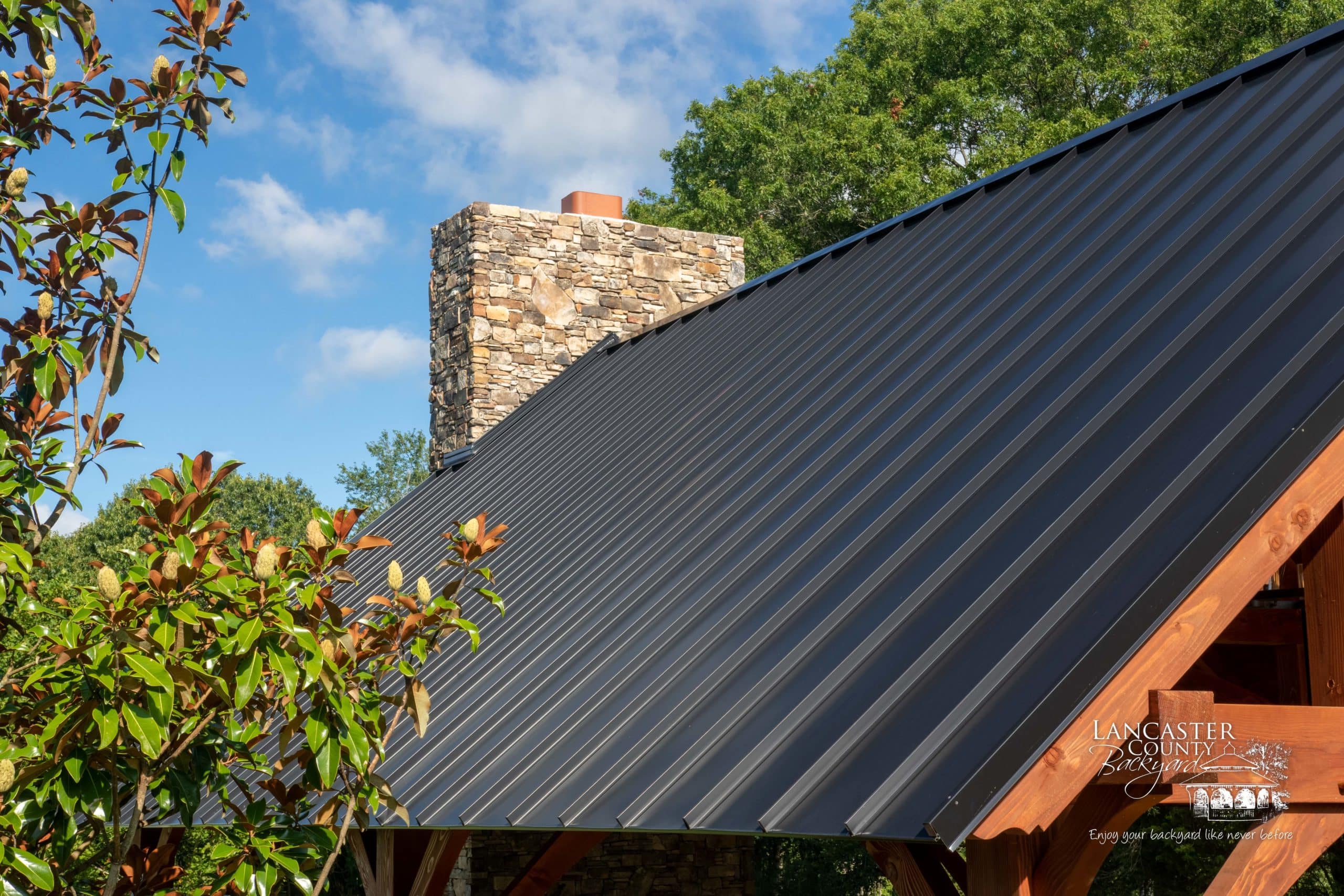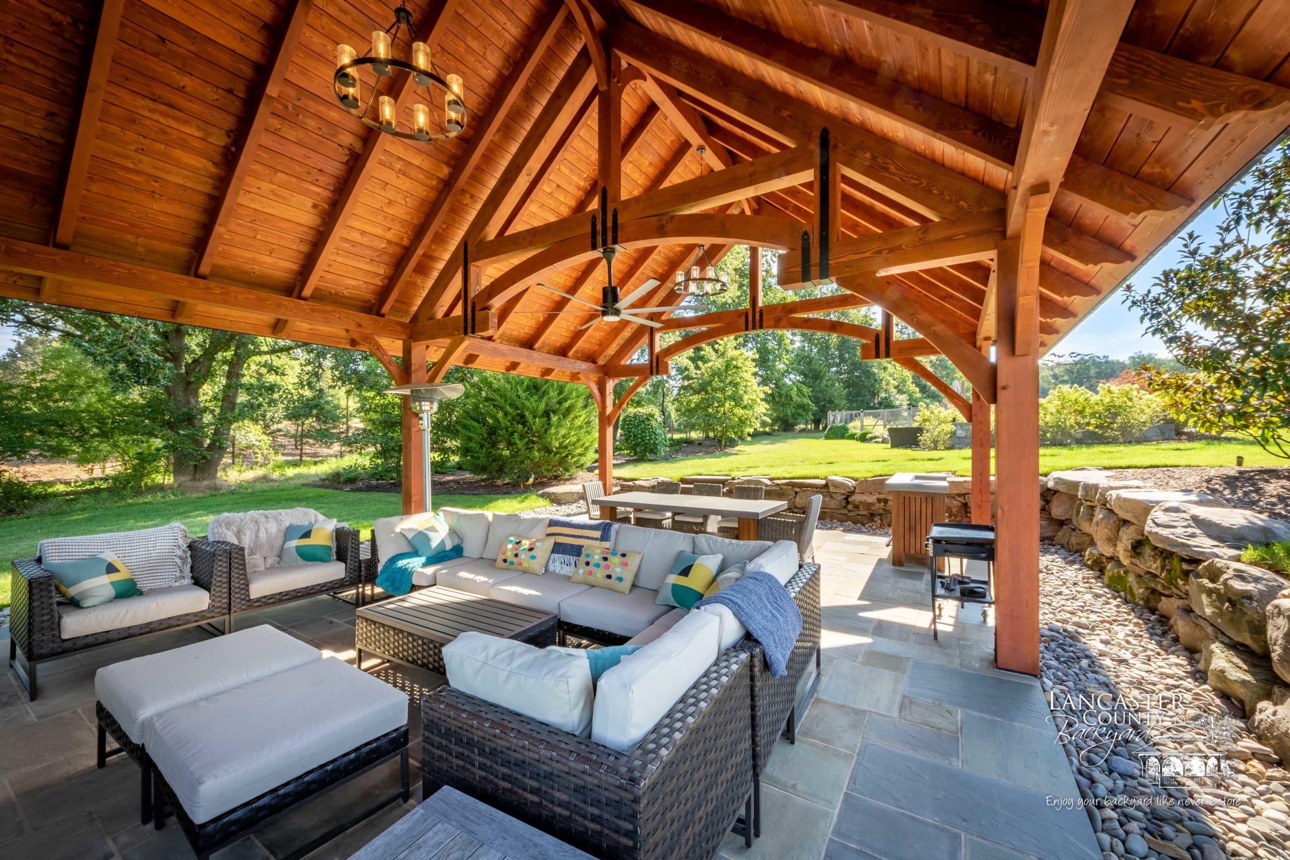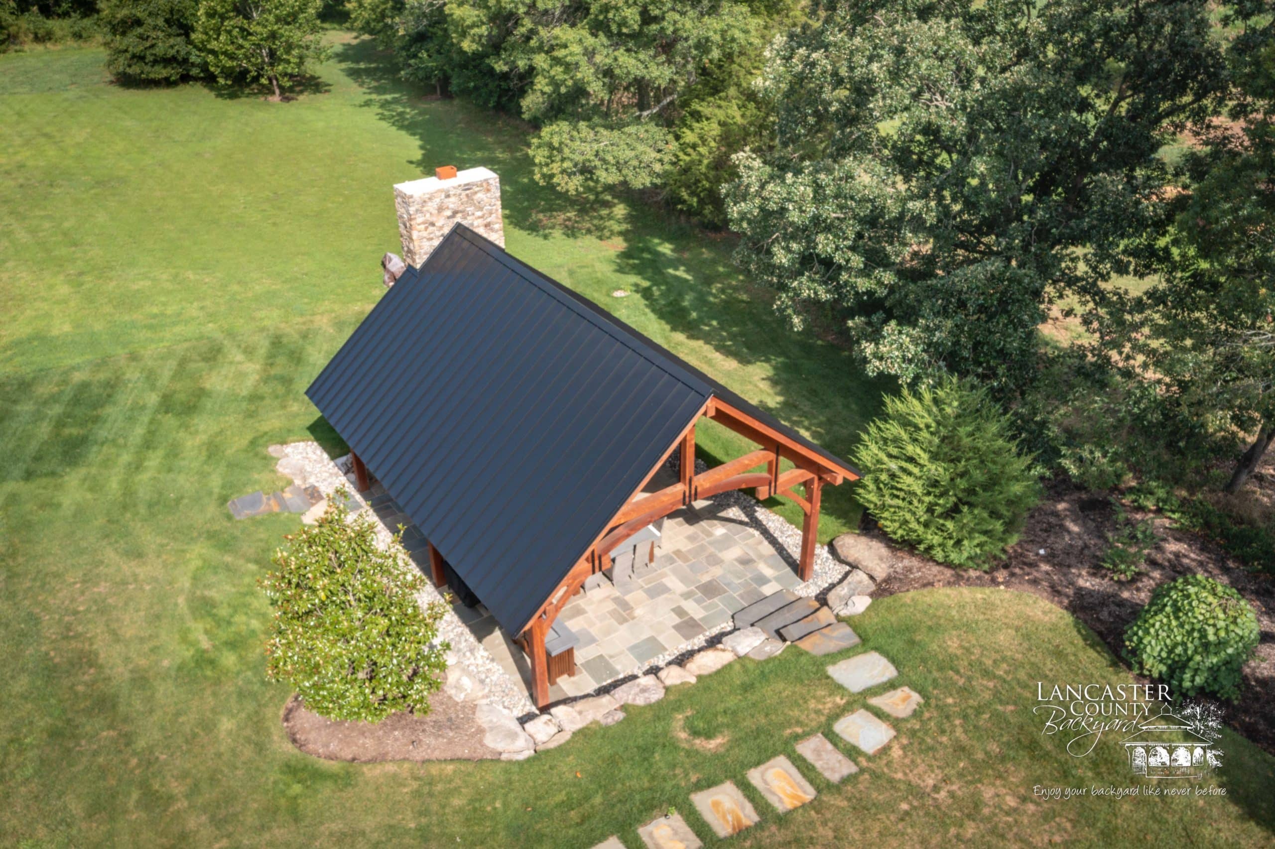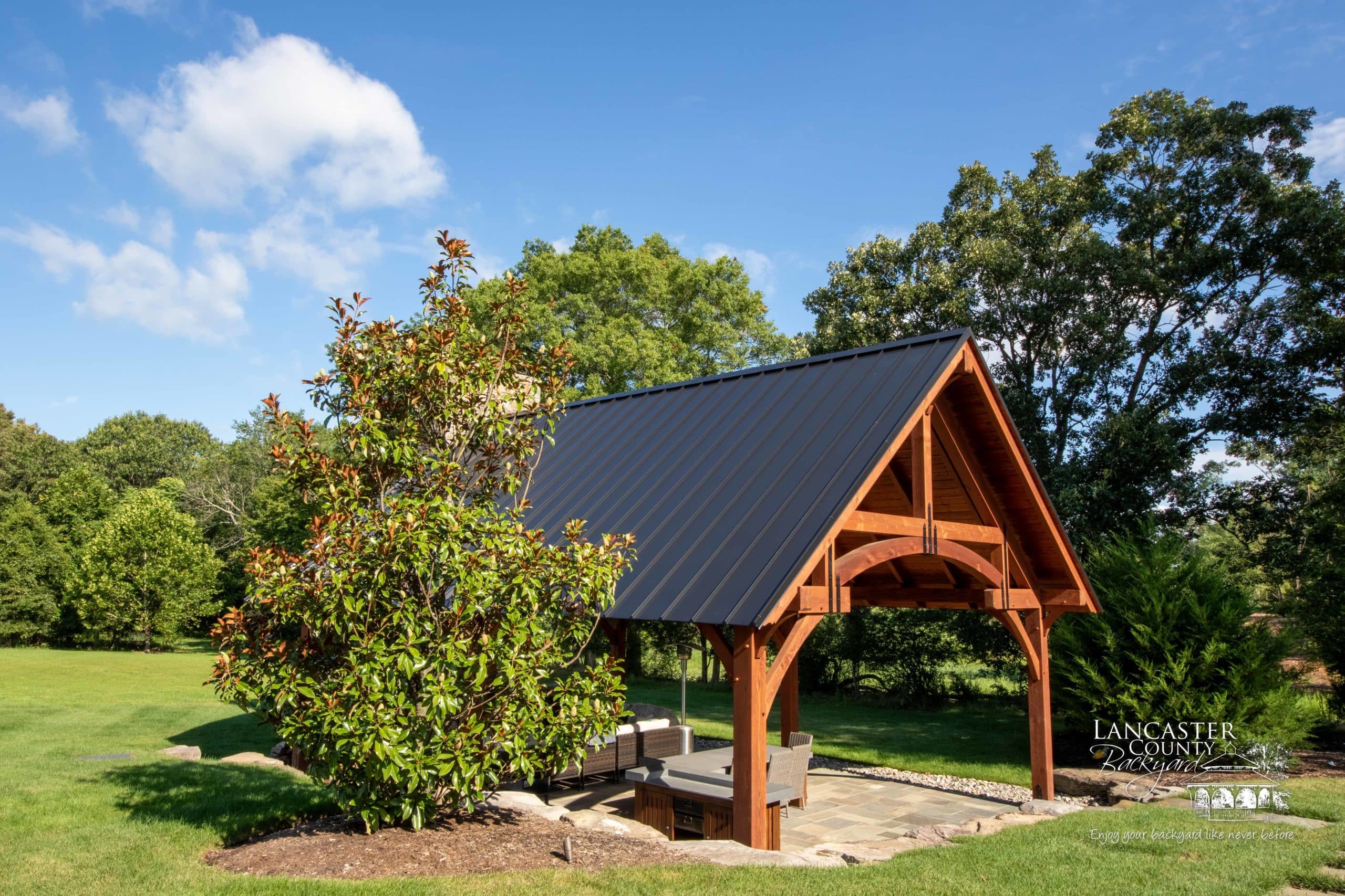 Interested in your own Grand Teton Timber Frame Pavilion? Our pavilions are customizable! Choose between our different roof materials, stain colors, and more, or add a kitchen, fireplace, or intricate stonework design. Whatever your dream is, we’ve got your backyard needs covered!
