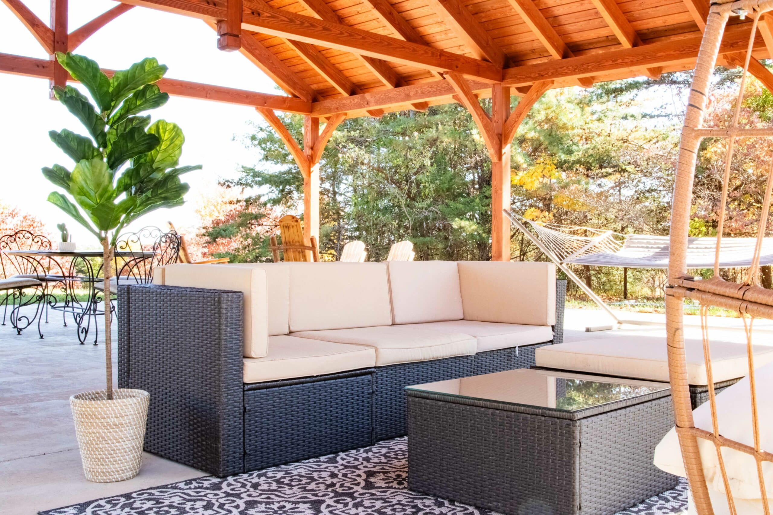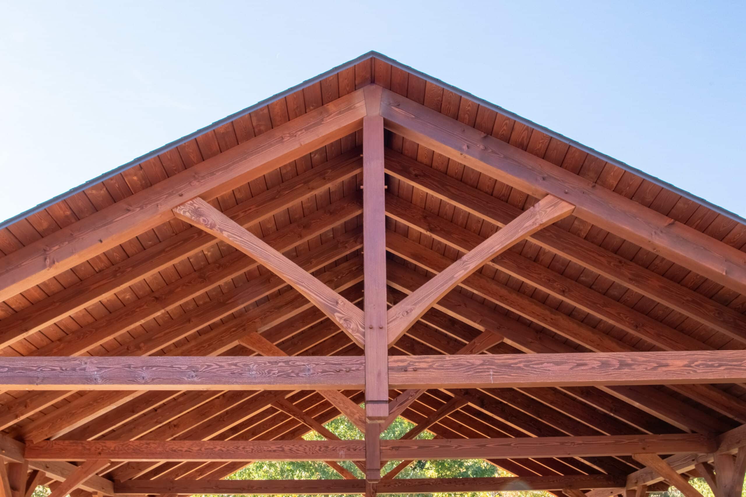 The pavilion is constructed using high-quality Douglas Fir lumber, renowned for its strength and resistance to the elements. Not only does this ensure the structure’s longevity, but it also adds to its rustic aesthetics.