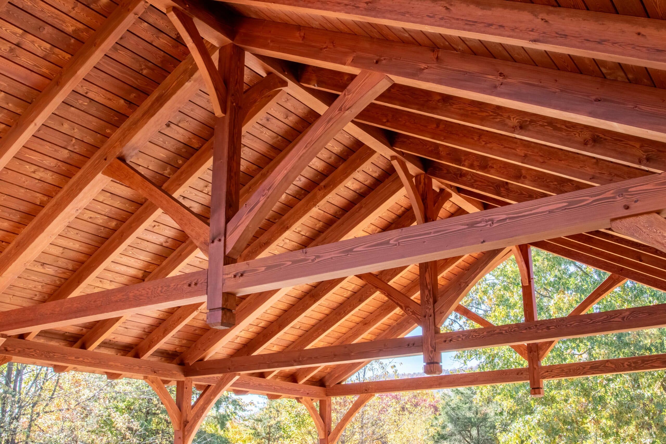 The Kingston timber frame pavilion from Lancaster County Backyard seamlessly integrates into this tranquil environment, offering a perfect spot for family gatherings, weddings, or community events. Built with the age-old method of construction called Timber Framing that uses mortise and tenon joinery, which is done with two pieces of wood, the mortise being the hole in the one piece of wood, and the tenon being the piece of wood that is received into the mortise. For more information about this topic, you can see our articles about Timber Framing and Timber Frame Joints.