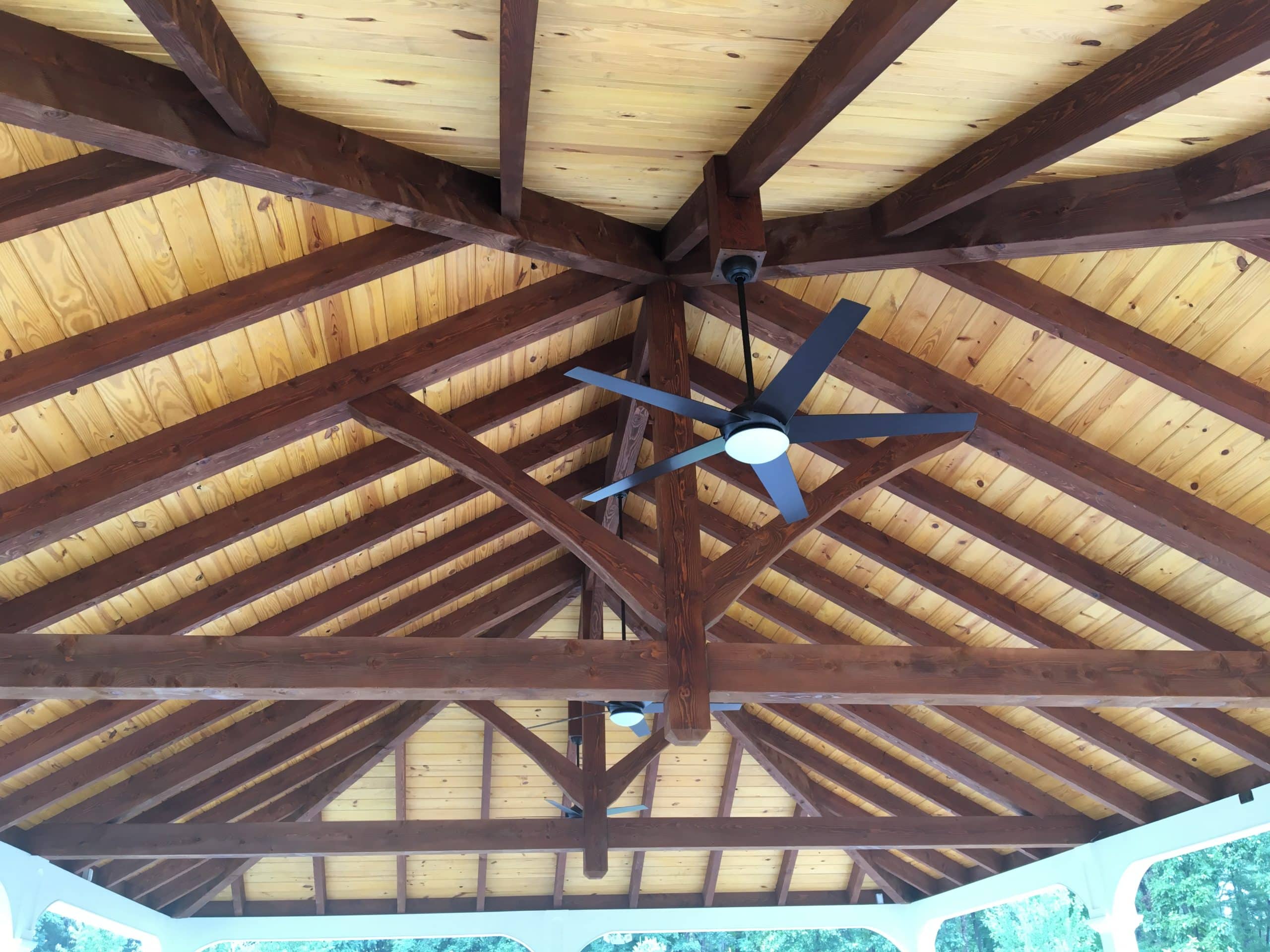 This private 30×45 Montford Pavilion combines the sleek modern finish of vinyl with classic timber frame trusses to create the perfect elegant backyard structure.