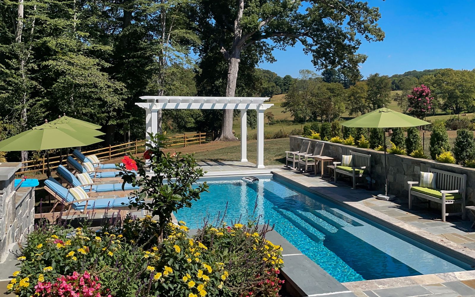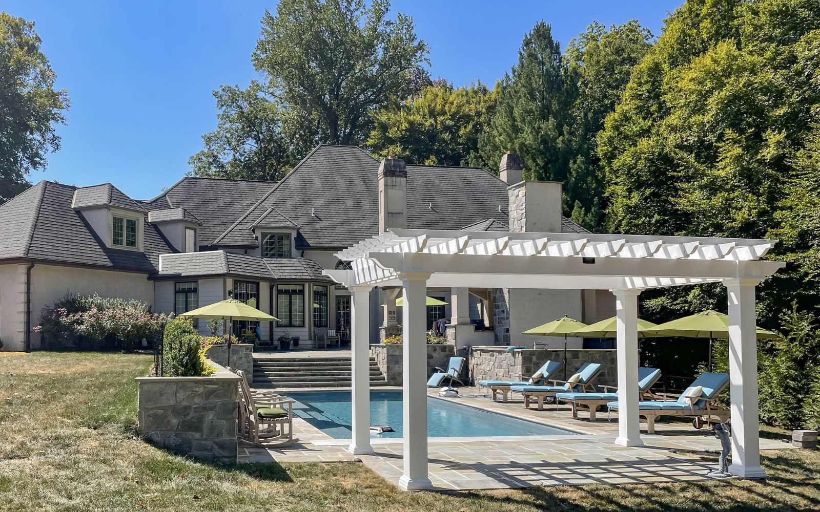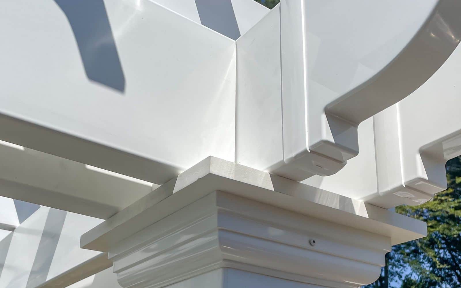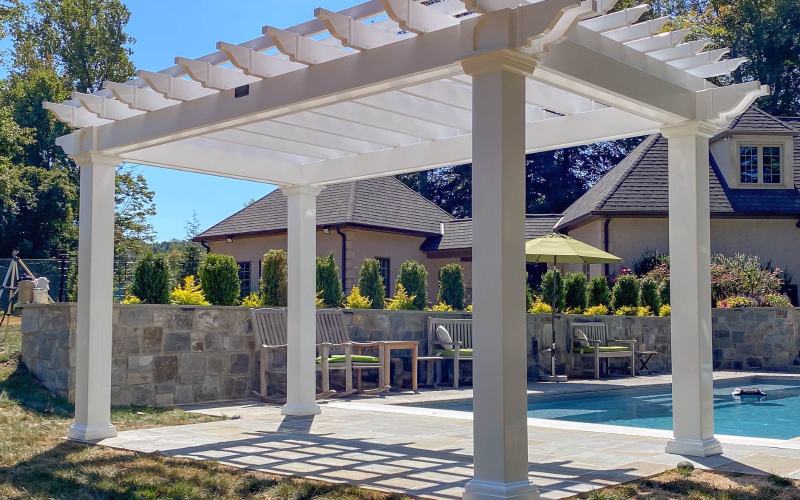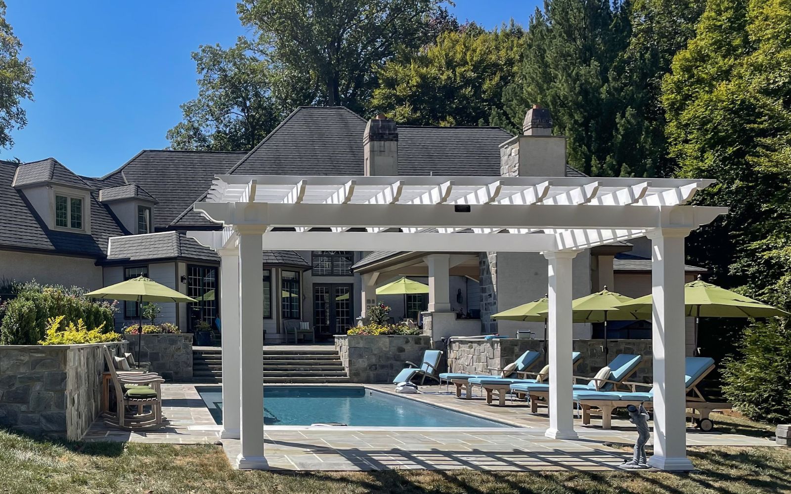 Our pergola builders crafted this 8×14 White Cancun Vinyl Pergola in Greenville Delaware with four 8×8 vinyl columns and a 90″ beam headroom height. The stainless steel post anchor brackets ensure the pergola’s lasting stability. The 2×8 beams, 2×6 rafters, and 1.75×3.5 shades give the Pergola its iconic look and the touch of shade this poolside benefits from.