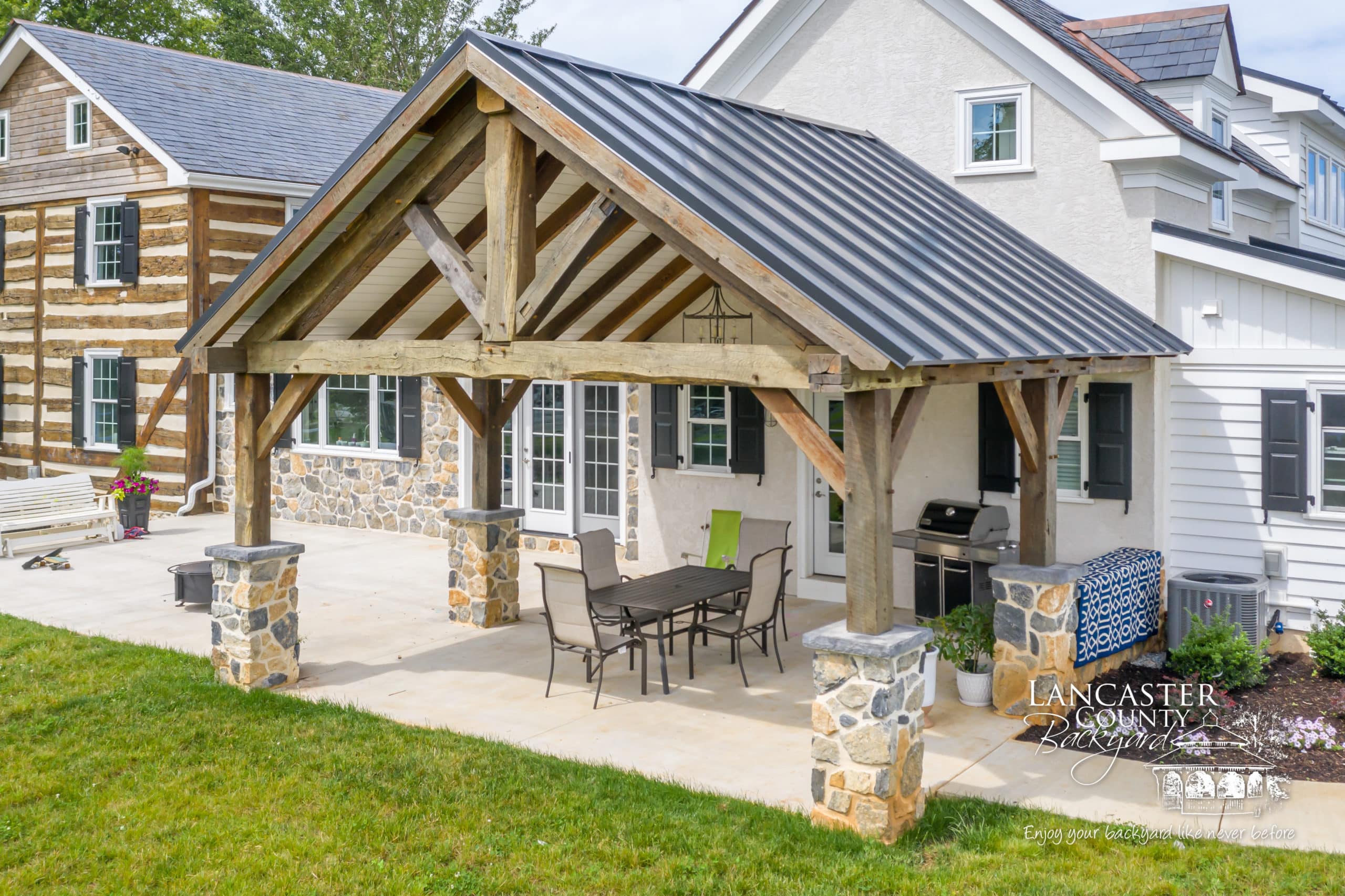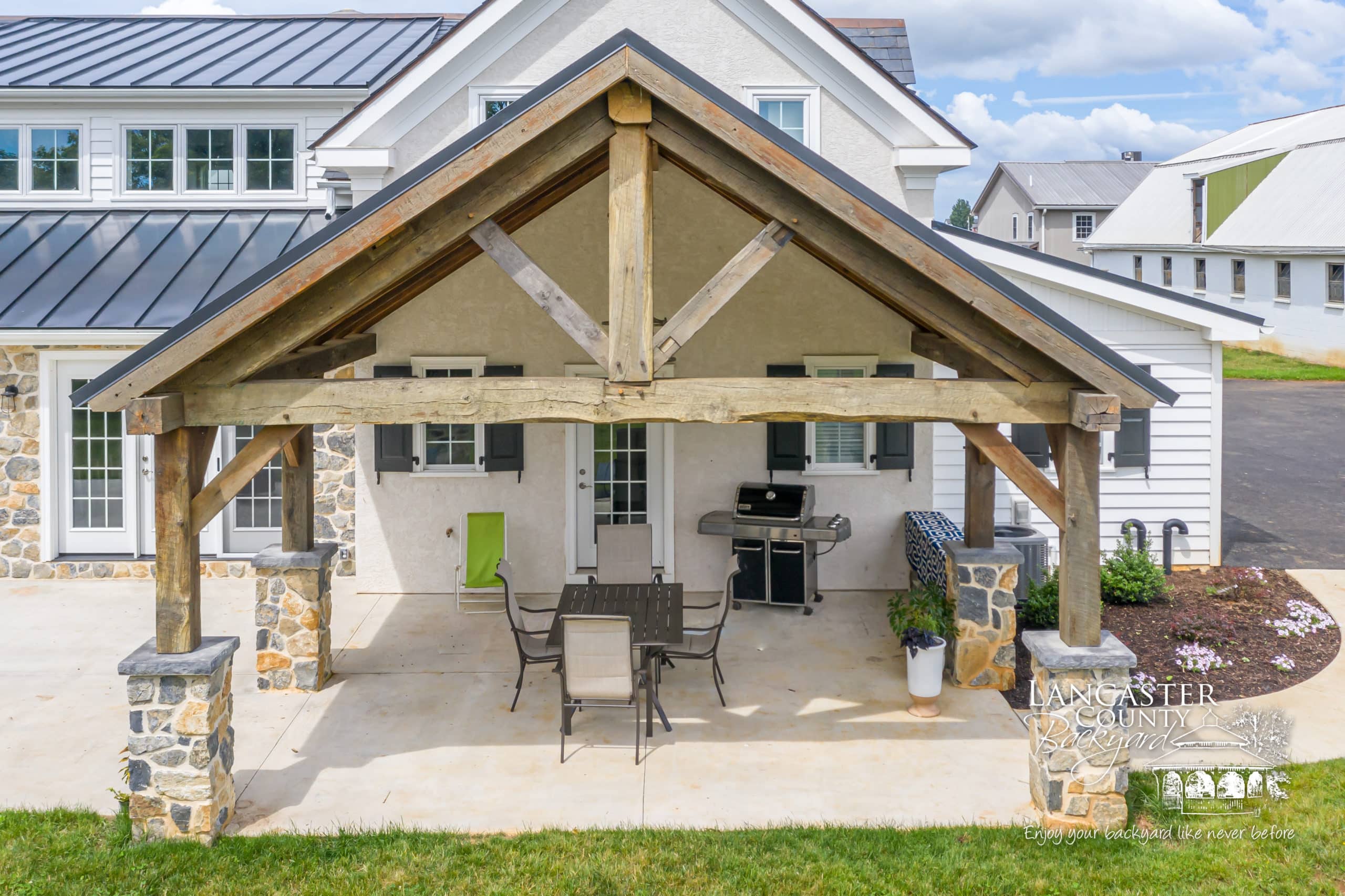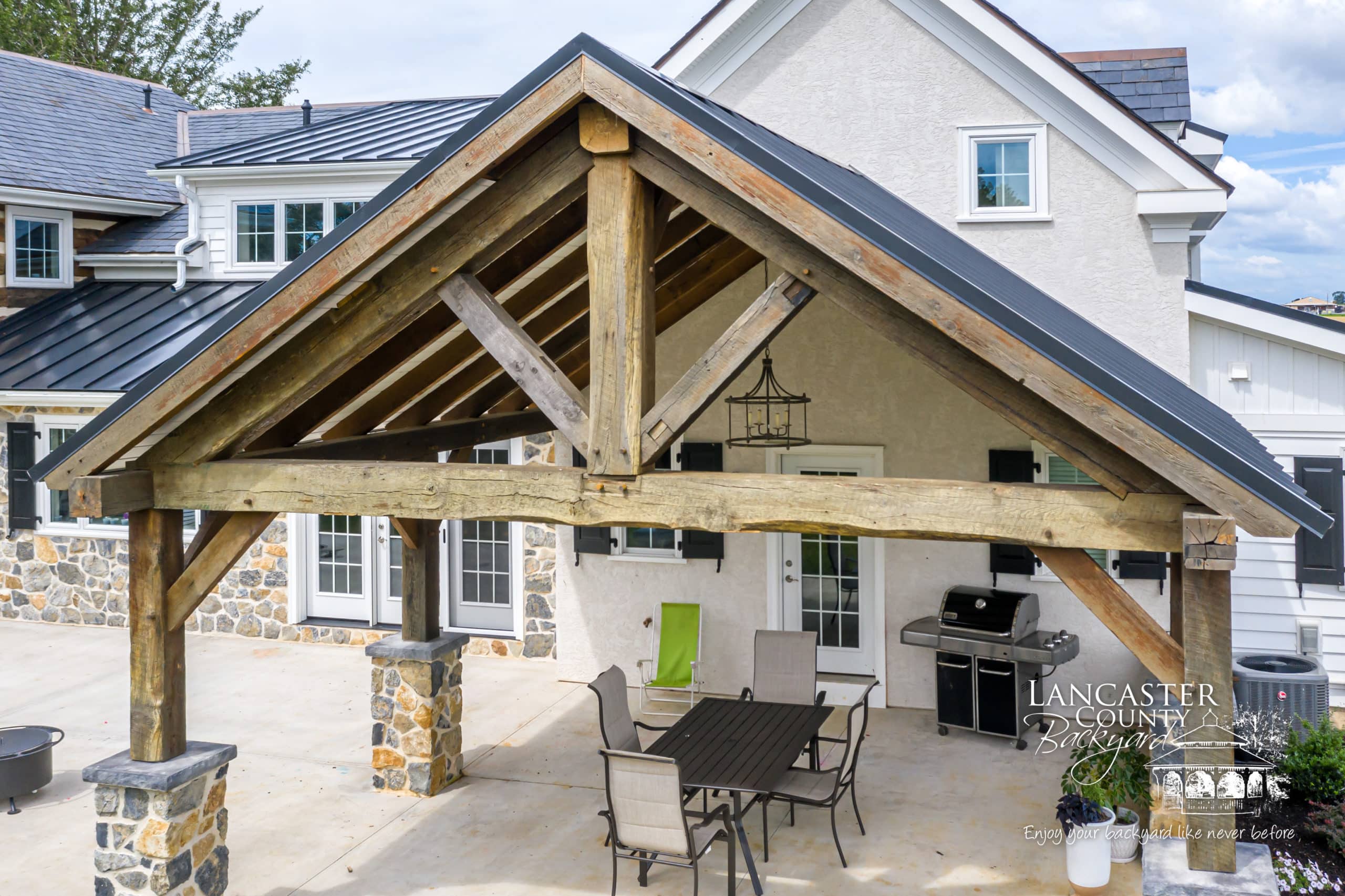 At Lancaster County Backyard, we build a variety of outdoor structures, including timber frame pavilions like the one featured in this project in Lancaster, PA. This project was one of the more unique jobs we’ve done, since it was constructed with reclaimed lumber. Not only does this project feature a timber frame pavilion, but it also includes custom timber frame beams in the kitchen area, also made from reclaimed lumber, completing the modern farmhouse style of this home.
