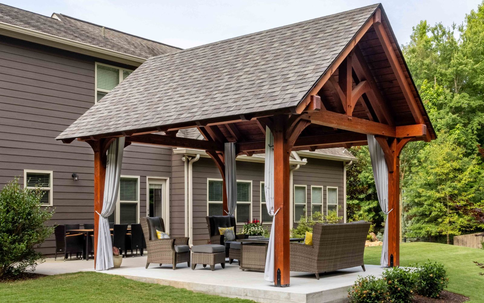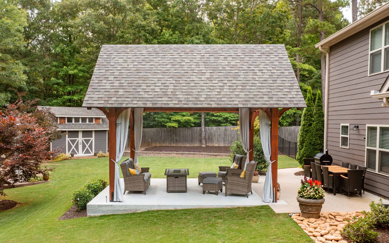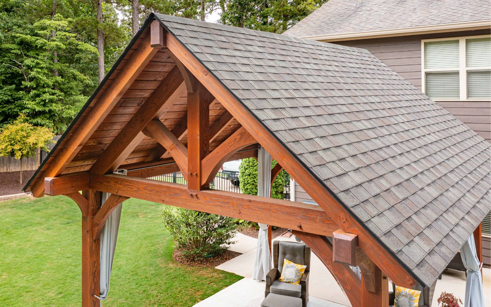 Check out our recently released upgraded package for the Kingston Pavilion! This 14×16 Kingston Pro Timber Frame Pavilion in Jefferson, GA, creates a lovely, relaxing area in this customer’s backyard. The side curtains create a private space to enjoy this Kingston Pro Timber Frame pavilion. Our Kingston Pro package includes a steeper roof pitch, longer 2’ gable overhangs, extended beams with braces, lowered top chords, and larger 10×10 posts.