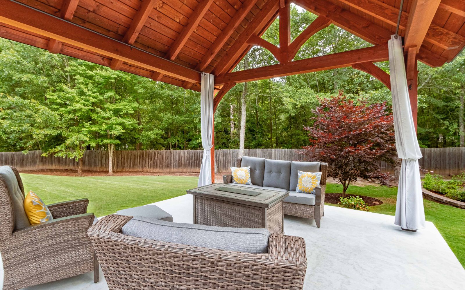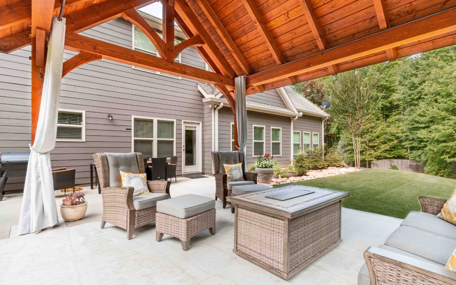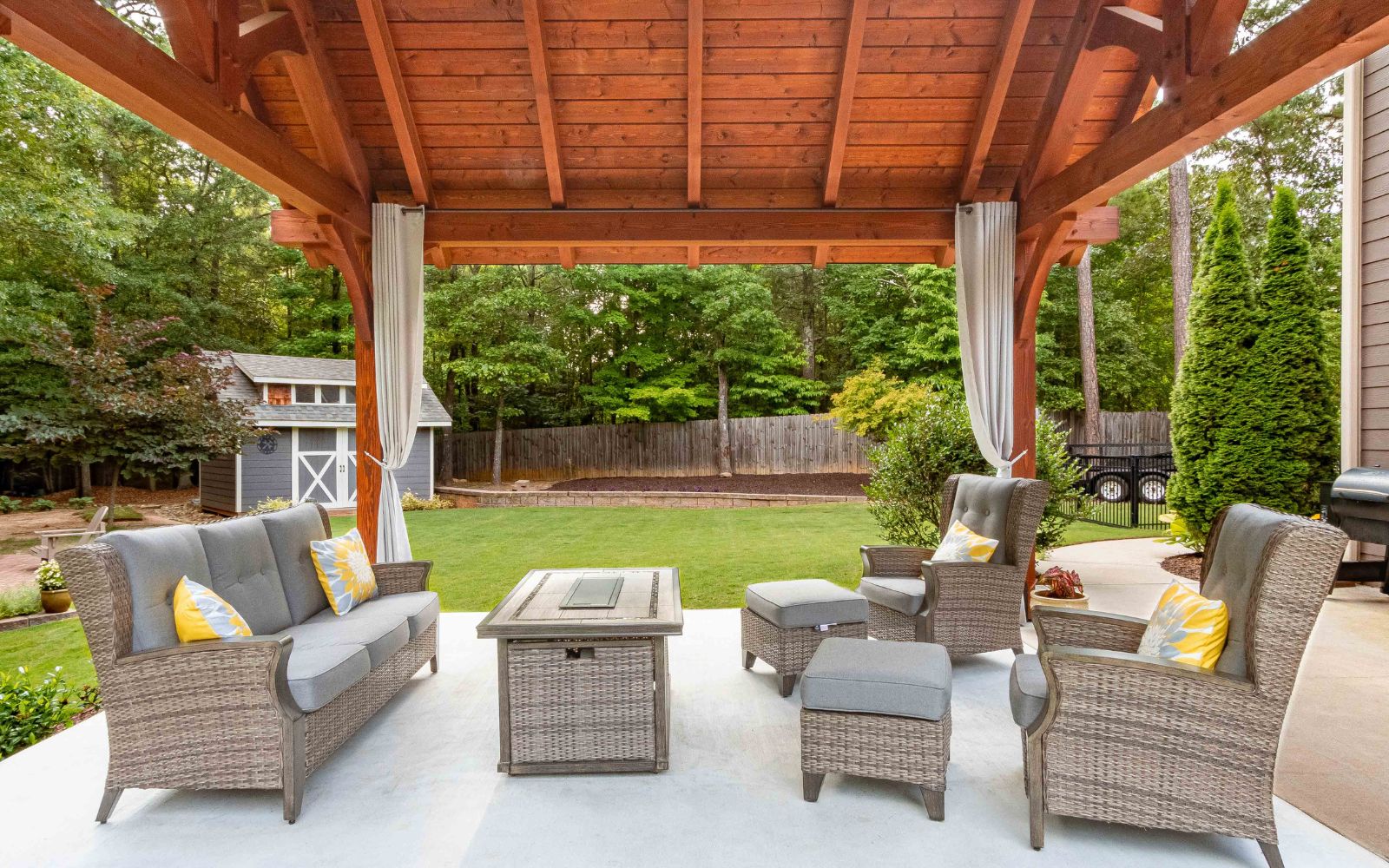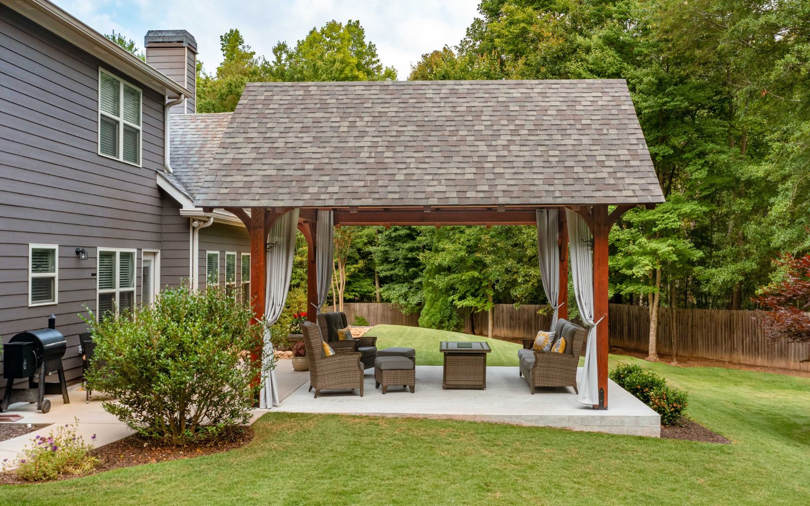 Check out our recently released upgraded package for the Kingston Pavilion! This 14×16 Kingston Pro Timber Frame Pavilion in Jefferson, GA, creates a lovely, relaxing area in this customer’s backyard. The side curtains create a private space to enjoy this Kingston Pro Timber Frame pavilion. Our Kingston Pro package includes a steeper roof pitch, longer 2’ gable overhangs, extended beams with braces, lowered top chords, and larger 10×10 posts.