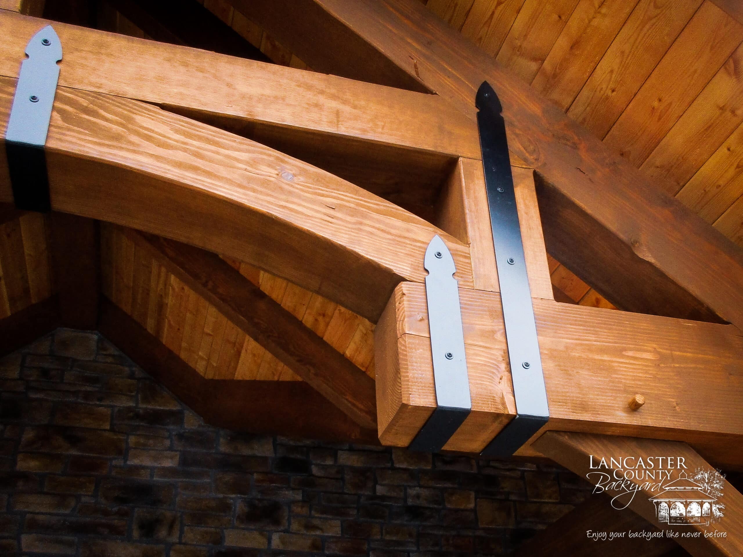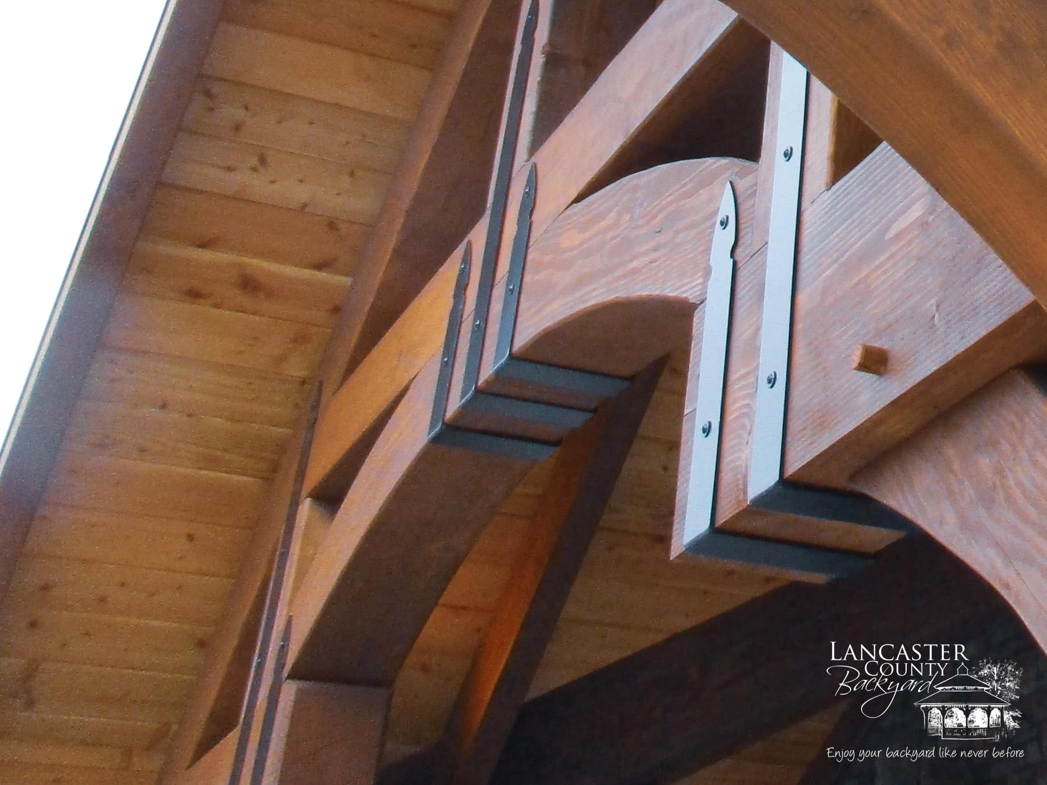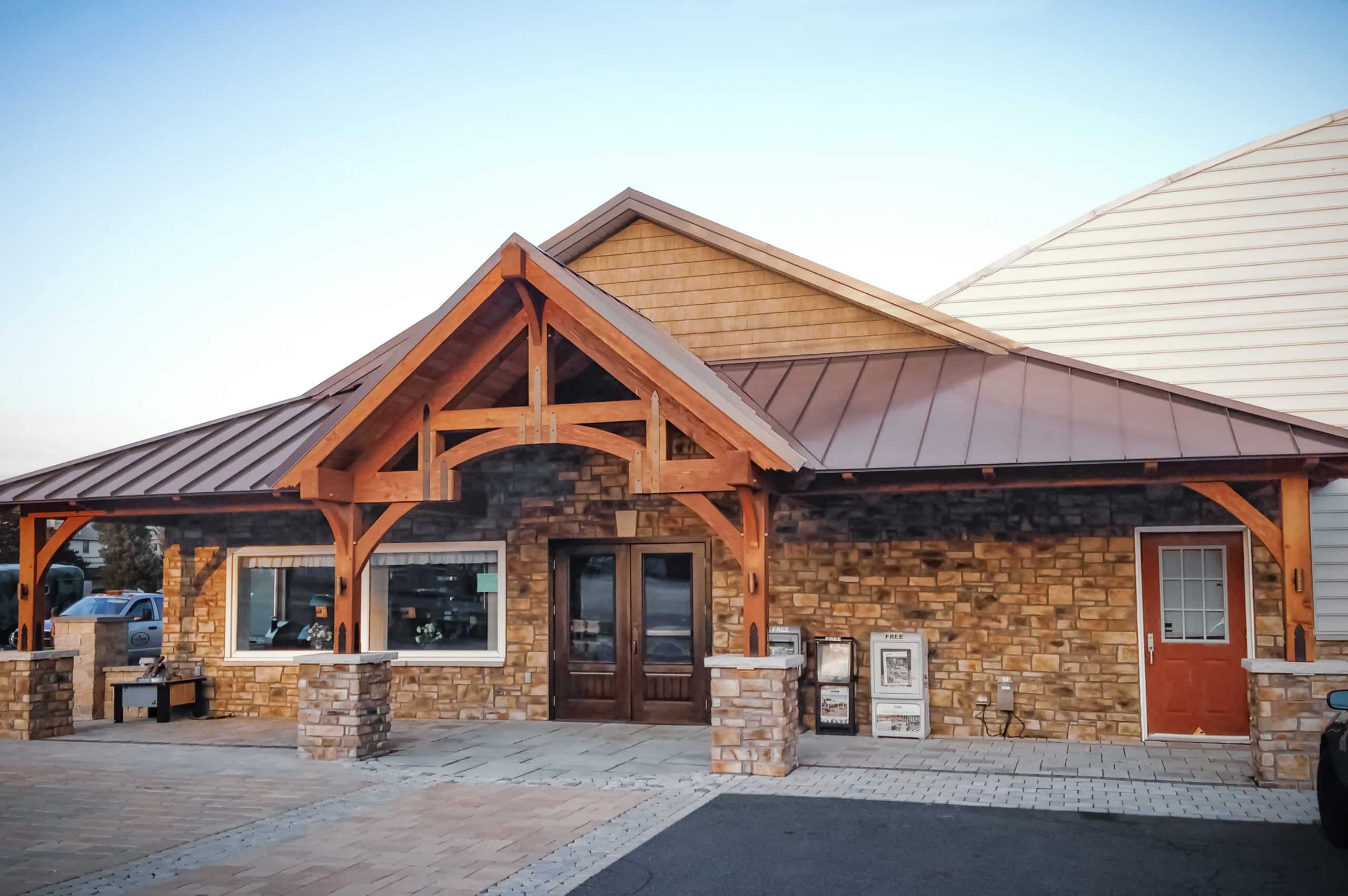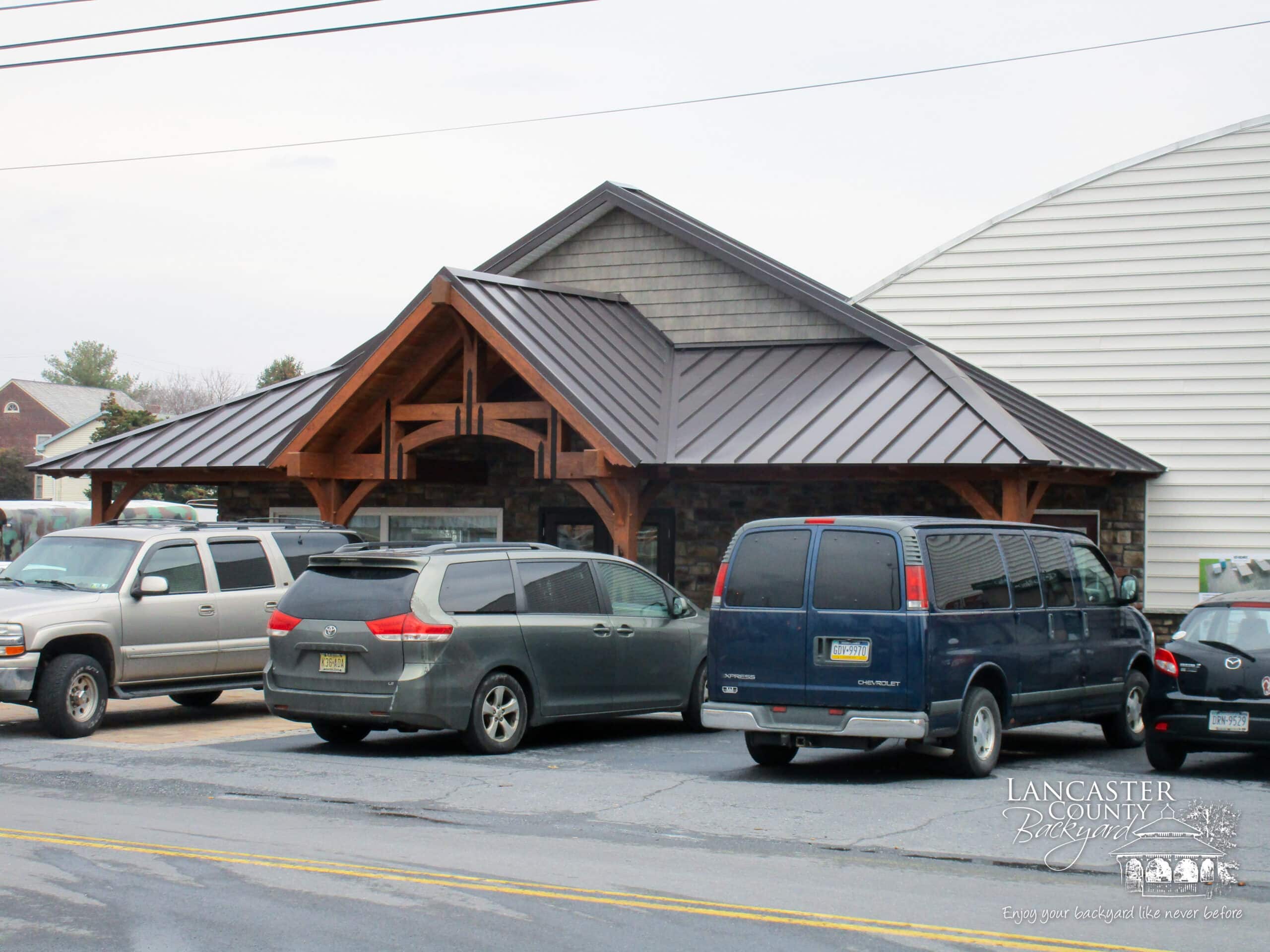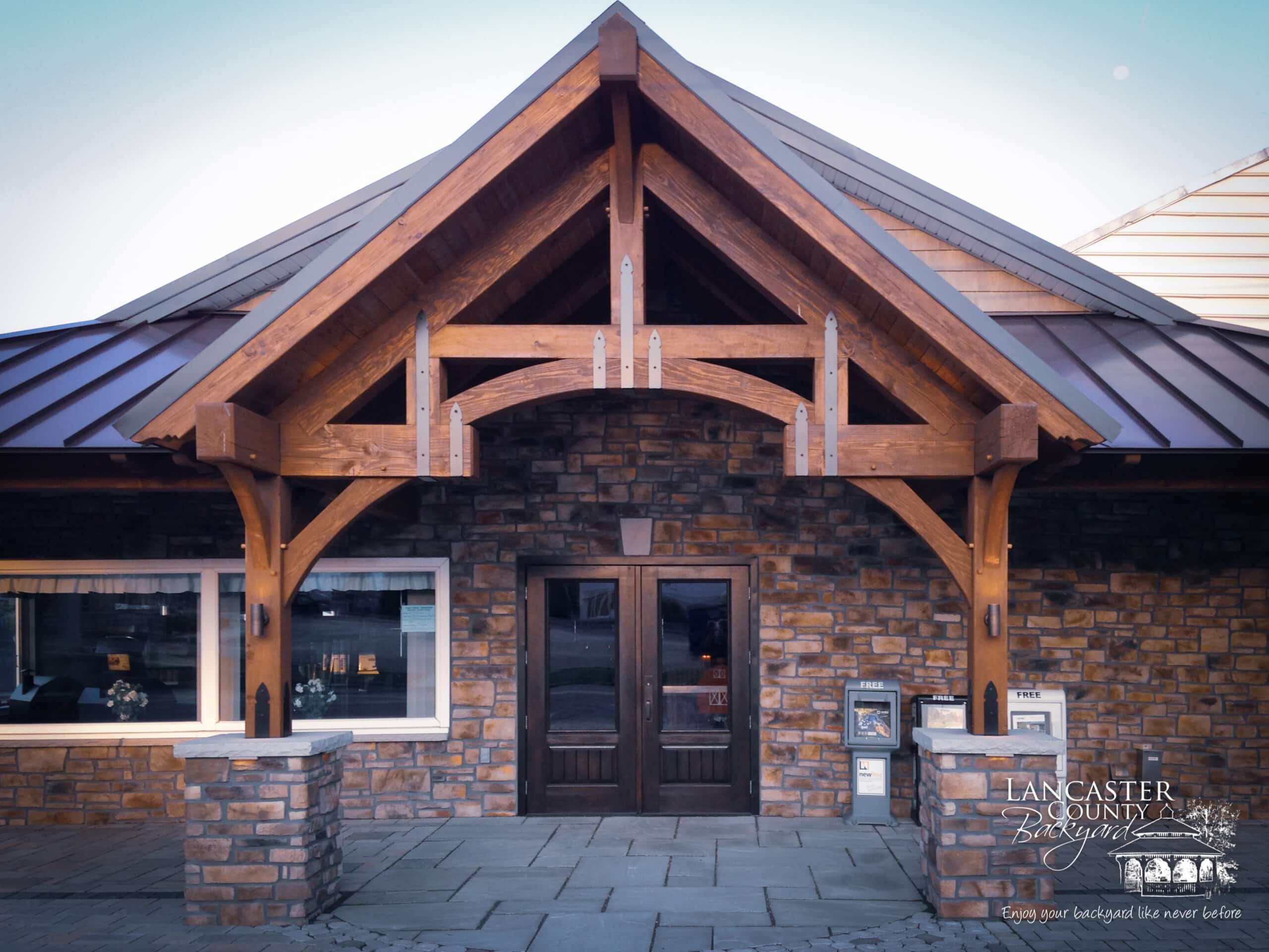 This timber frame storefront has many unique attributes. It has special lights. It has a special design. It has a stain color made just for this job. It is a building like no other. It is an eye-catching building with many unique features. It is best called a custom-designed building. Here at Lancaster County Backyard, custom designs are what we are passionate about. It is our pleasure to change the blueprint to match the customer’s needs. In this case, we drew from our designs and experience in timber frame pavilions. Then we changed and fitted the design to fit the needs of Sauders.
