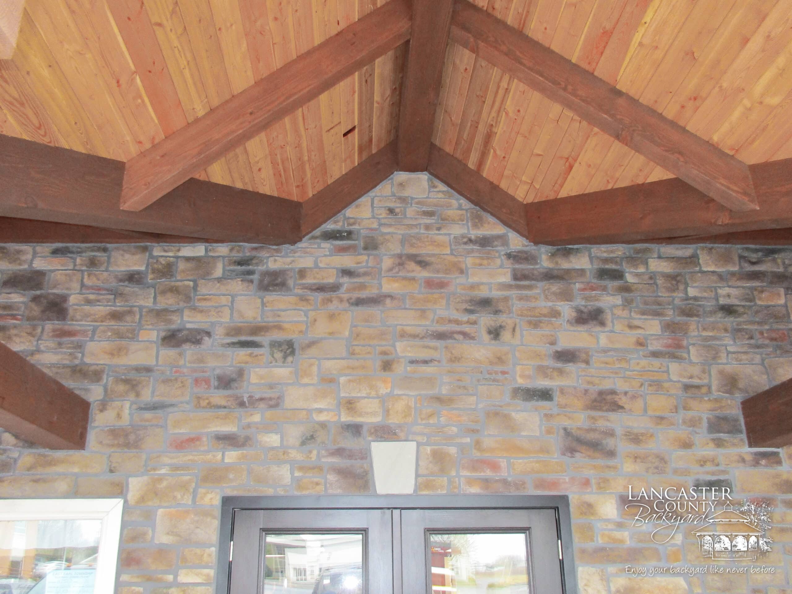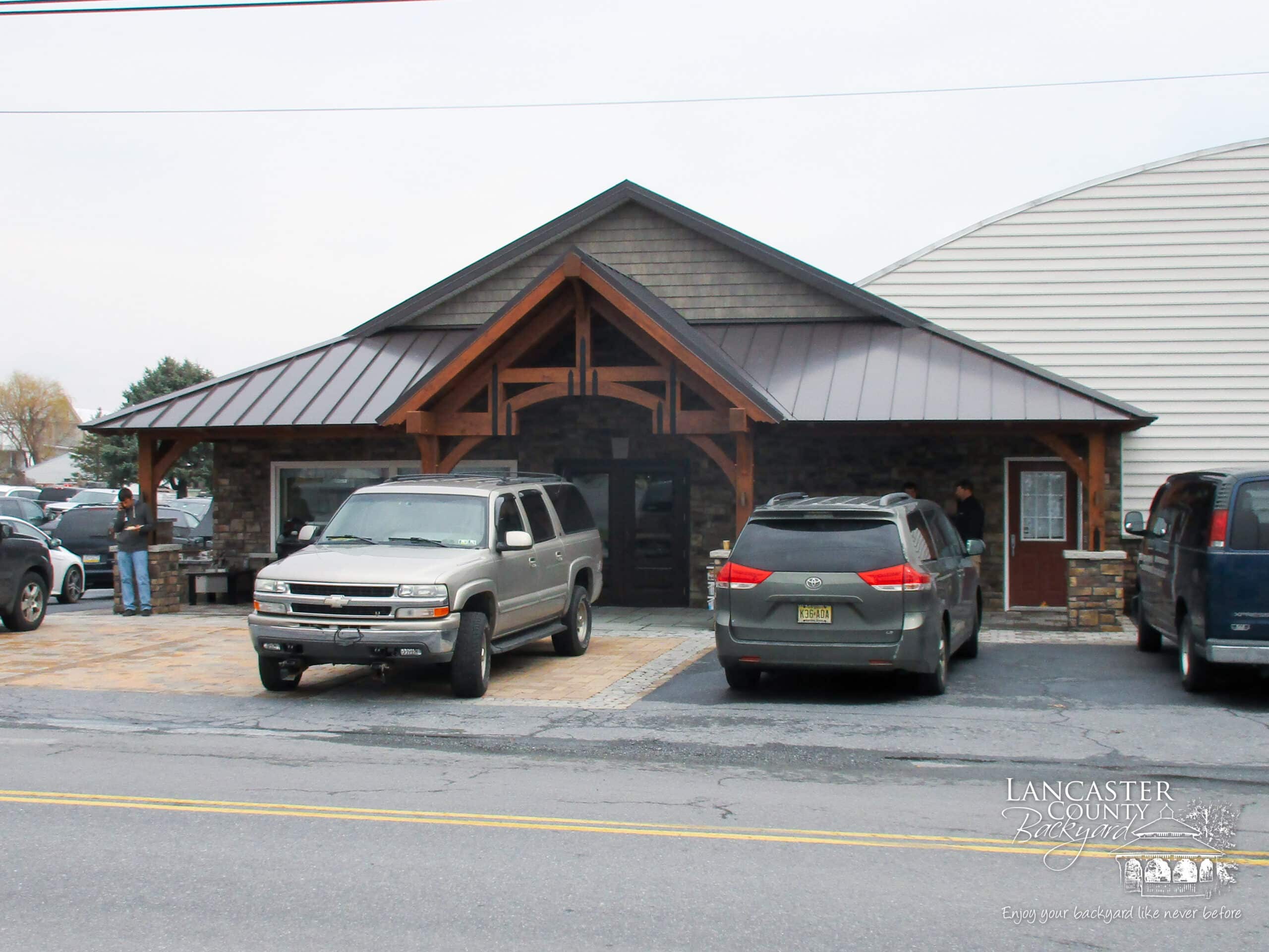 In 2016, Sauders Hardscapes, located in Blue Ball, PA, contacted us at Lancaster County Backyard about building a timber frame storefront for their showroom. Sauders has been working on improving its hardscape paver outlet center over the last few years. This January 2017 mortise and tenon project is a great addition to this endeavor. It had been very needful to give their reputable showroom a facelift. Now with a brand new front, Sauders’ customers are greeted by this stunning piece of artwork and introduced to a great experience at Sauders’ store and showroom.