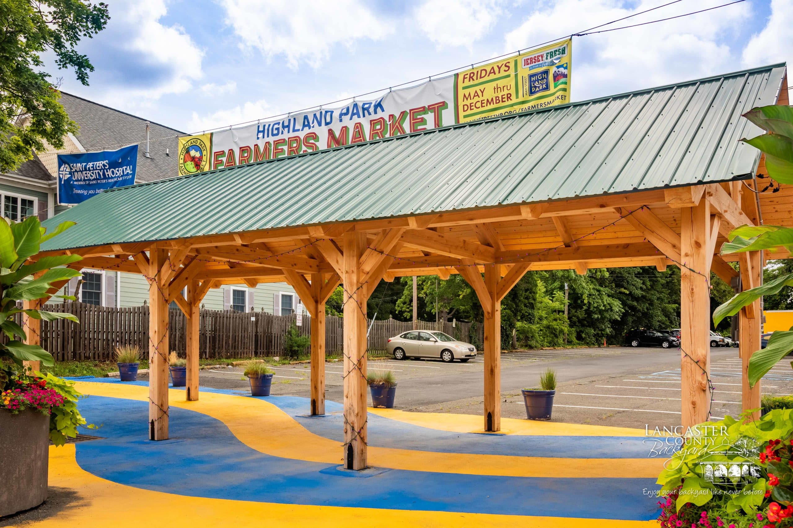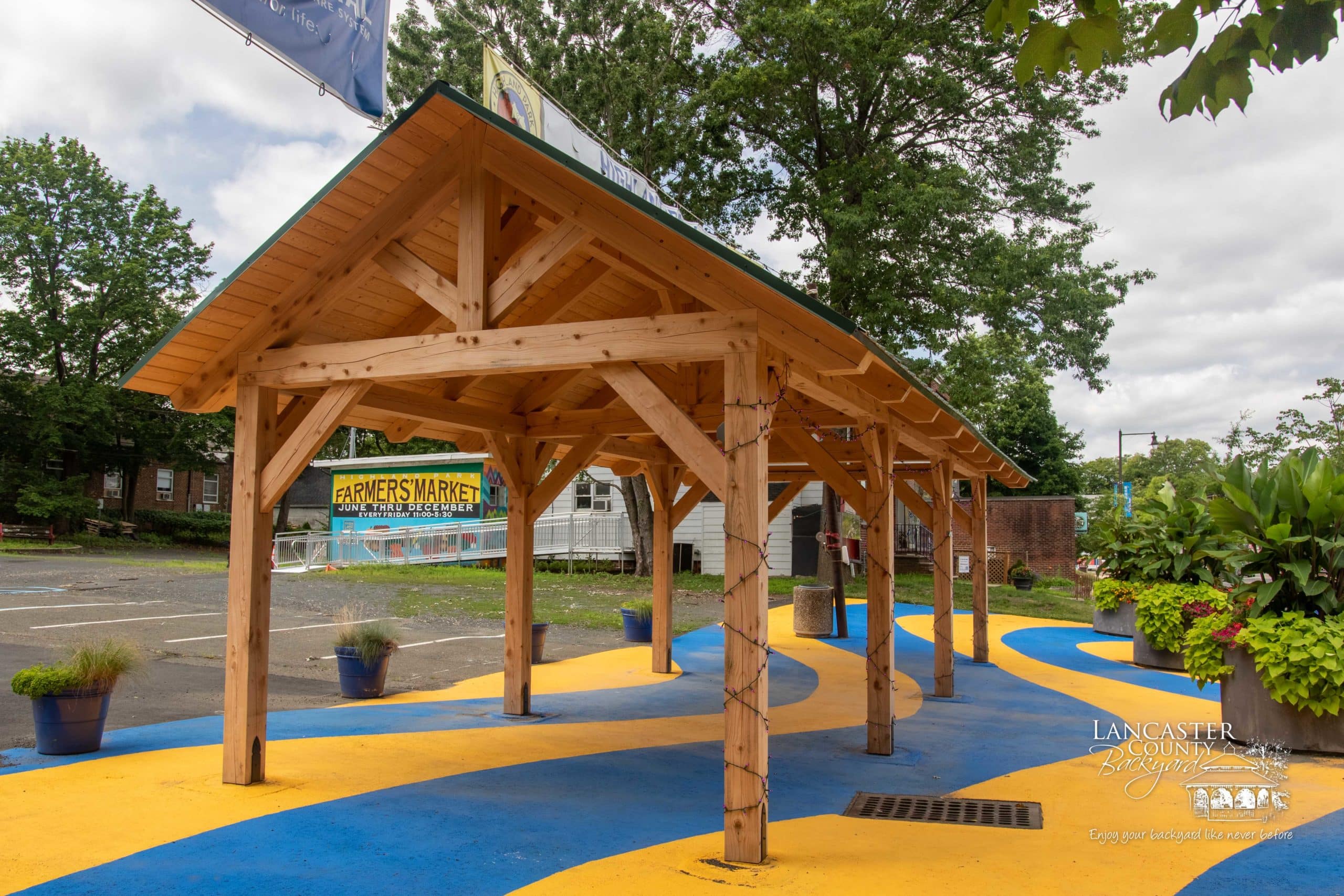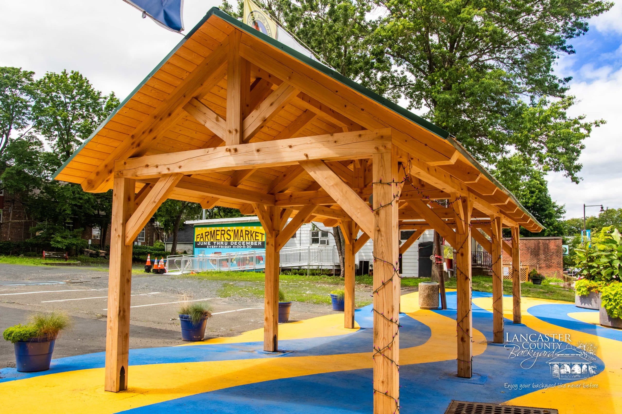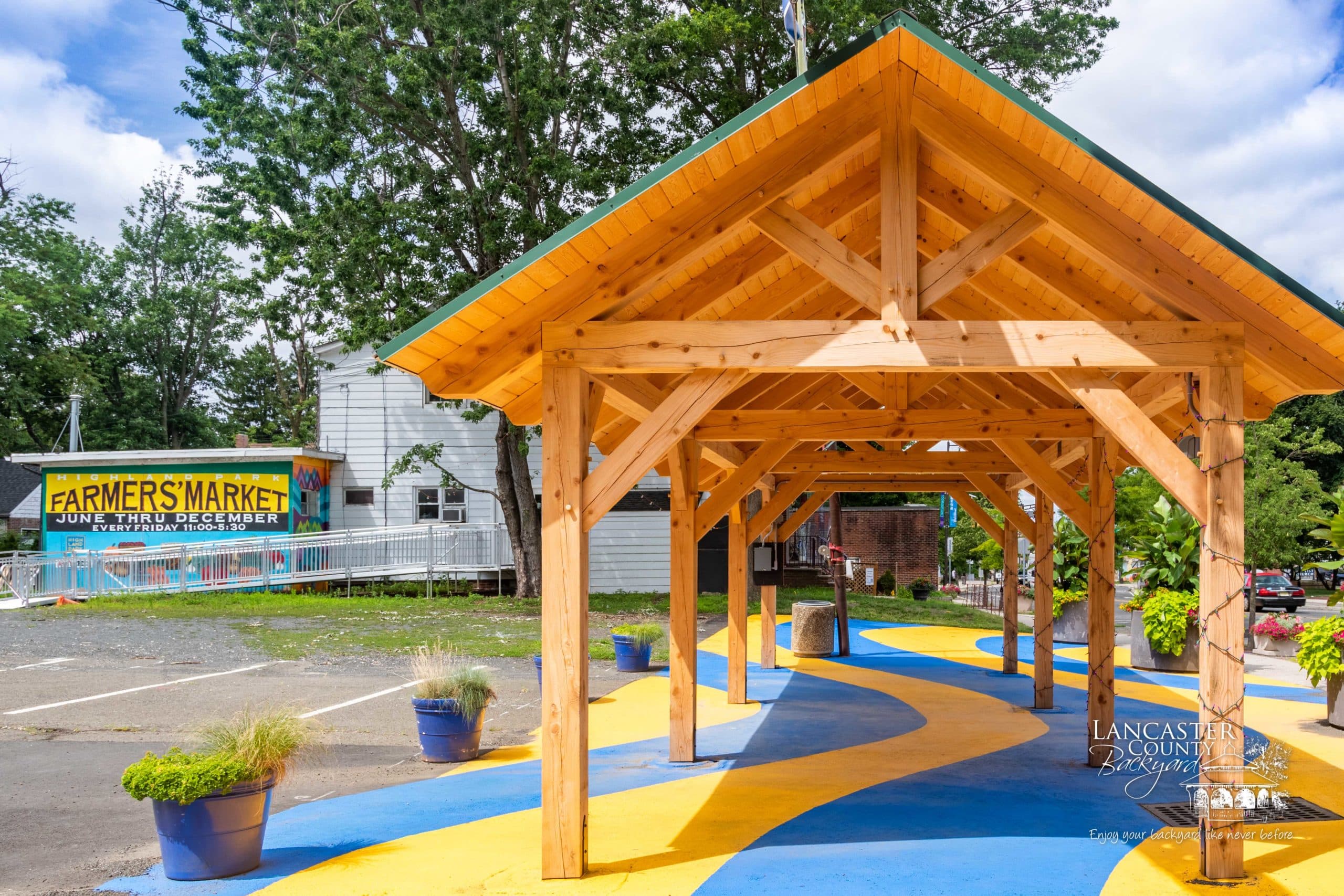 We recently completed this beautiful 12×36 commercial Timber Frame Pavilion in Highland Park, NJ, for Main Street Highland Park. This Kingston Pavilion was designed specifically to showcase vendors’ products and goods and serve as an entrance to the Farmers Market that runs year-round. Thanks for working with us, Main Street Highland Park. We trust this Pavilion will be an asset to the town of Highland Park, NJ.